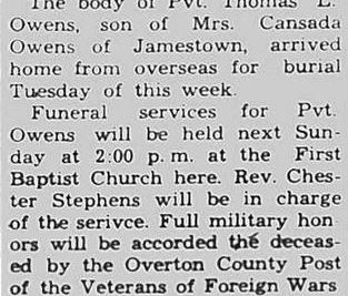 Funeral services were held Sunday April 10, 1949 at the Baptist Church of Jamestown for Pvt. Thomas L. Owens, son of Mrs. Cansada Owens. Pvt. Owens volunteered for service in 1940. He arrived overseas November 8, 1942 in the French Morroco. From there he continued in active service until his death in Belgium in 1945. He was a member of the 2nd Armored Division which became known as “Hell on Wheels.”