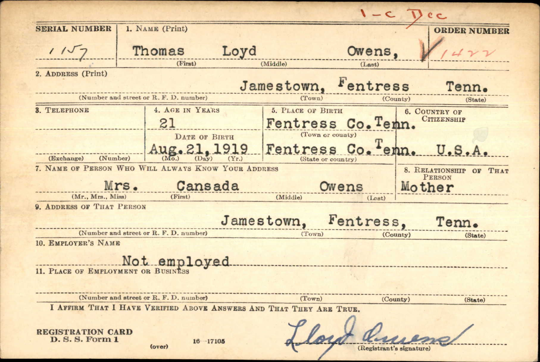 Thomas Loyd Owens was born on 21 August 1919,the son of Hiram Hayden Owens and Ava Cansada Owens.
