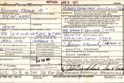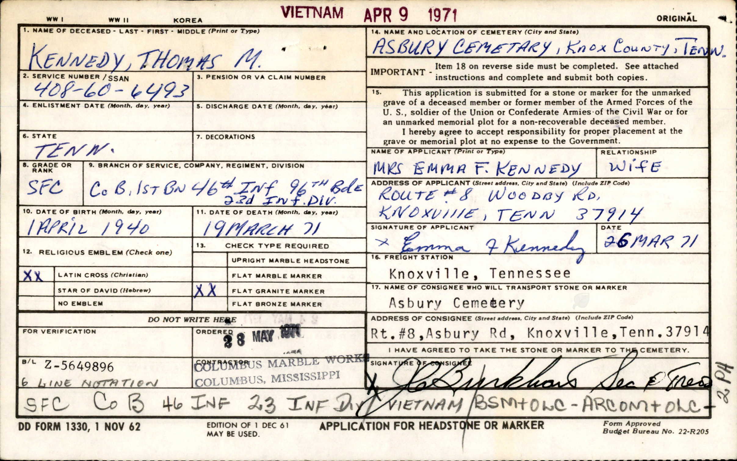 Sergeant First Class Thomas Martin Kennedy was born April 1, 1940, in Knoxville, Tennessee. He was the son of Enoch B. and Hazel Kennedy, Sr., and a member of Hillcrest Baptist Church. Sgt. Kennedy attended Carter High School in Knoxville before entering the United States Navy in 1957. He later received his high school diploma while in the service. He joined the United States Army in 1960 and remained in the Army till his death. He had served in Korea and had begun his second tour in Vietnam February 6, 1971. He was wounded in his first tour in Vietnam, 1968-1969, and received the Army commendation Medal, Oak Leaf Cluster, Bronze Star, and a Purple Heart. He was killed in an ambush in viet on March 19, 1971, while serving with the 196th Light Infantry Brigade. He was survived by parents, two sons, one daughter, two sisters, and two brothers. Sgt. Kennedy was buried with full military honors on March 26, 1971, at Asbury Cemetery.