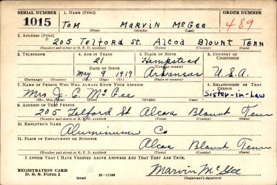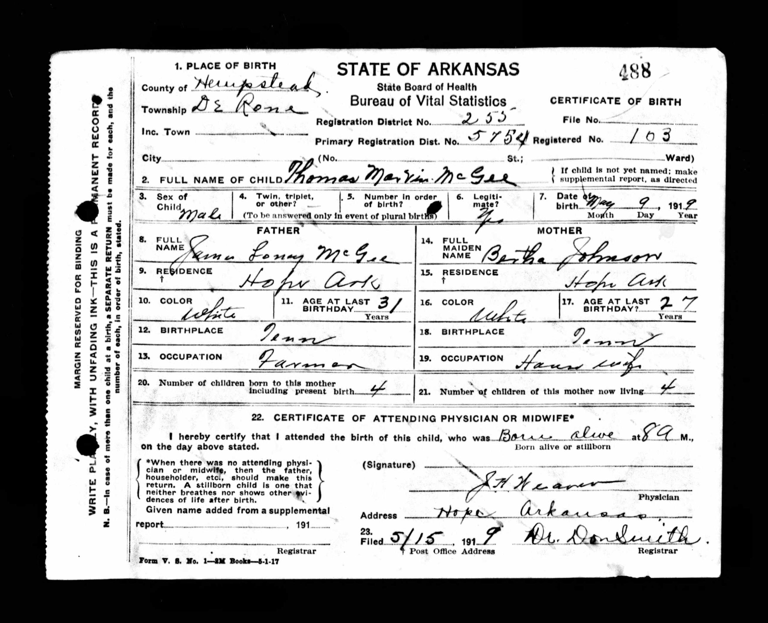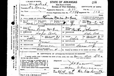 Thomas Marvin Mc Gee was born on 9 May 1919 in Lonoke, Lonoke County, Arkansas. He was the son of James Lonnie McGee and Bertha Lucinda Johnson. Husband of Catherine brown. He was killed in action in the Western Pacific.