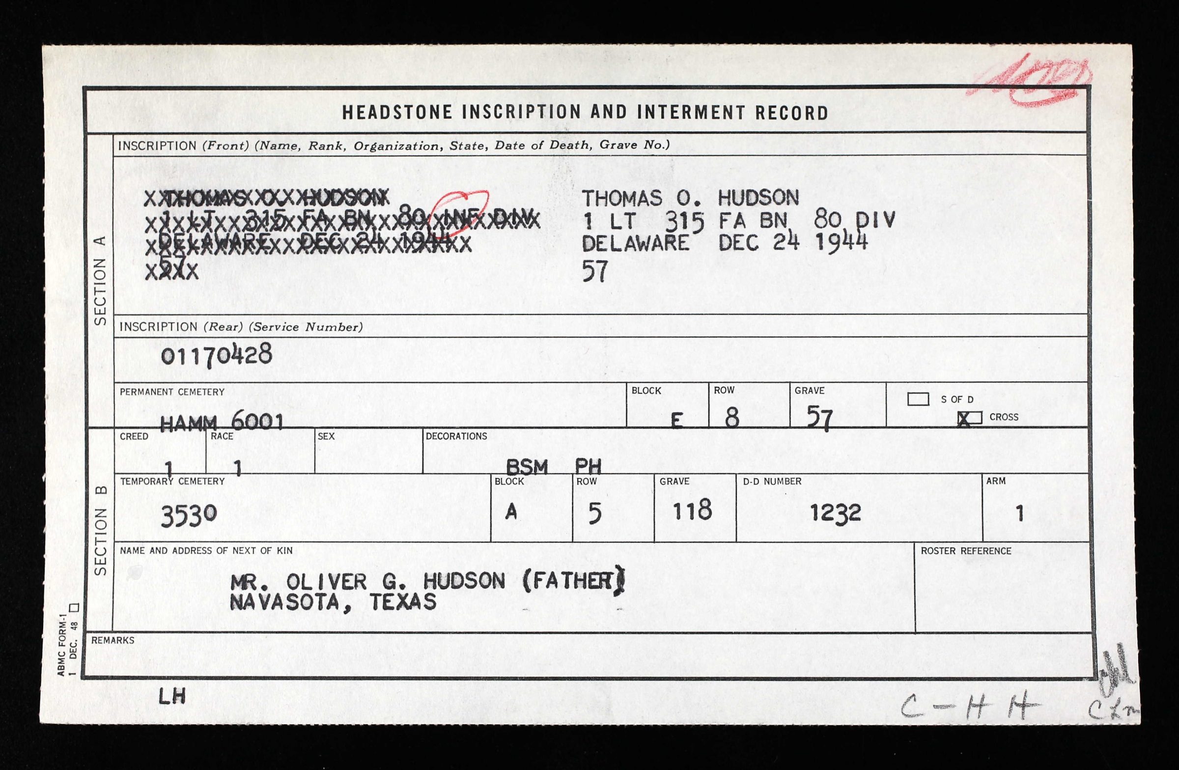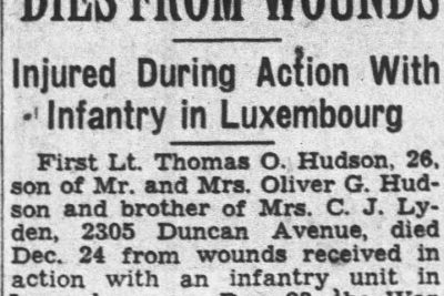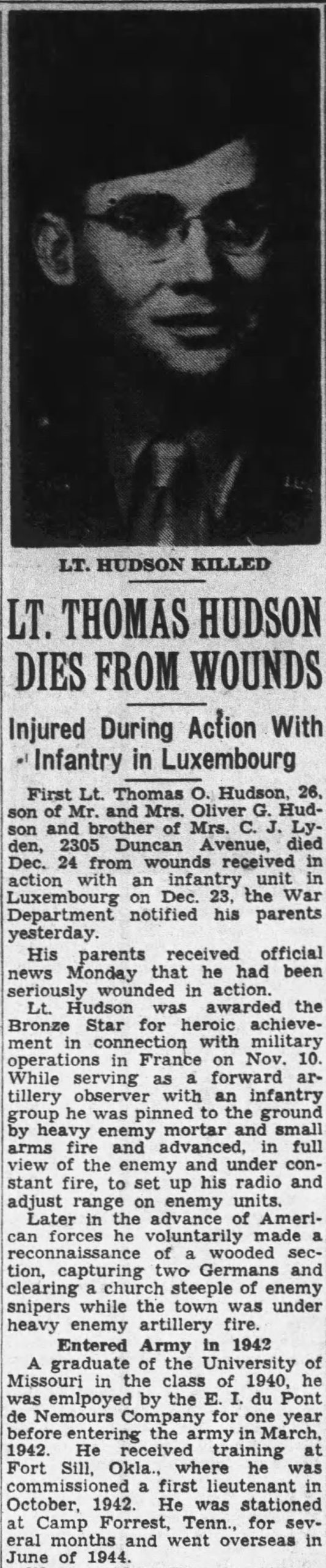First Lt. Thomas O. Hudson, 26, son of Mr. and Mrs. Oliver G. Hudson and brother of Mrs. C.J. Lyden, 2305 Duncan Avenue, died Dec. 24 from wounds received in action with an infantry unit in Luxembourg on Dec. 23, the War Department notified his parents yesterday. His parents received official news Monday that he had been seriously wounded in action. Lt. Hudson was awarded the Bronze Star for heroic achievement in connection with military operations in France on Nov. 10. While serving as a forward artillery observer with an infantry group he was pinned to the ground by heavy enemy mortar and small arms fire and advanced, in full view of the enemy and under constant fire, to set up his radio and adjust range on enemy units. Later in the advance of American forces he voluntarily made a reconnaissance of a wooded section, capturing two Germans and clearing a church steeple of enemy snipers while the town was under heavy enemy artillery fire.