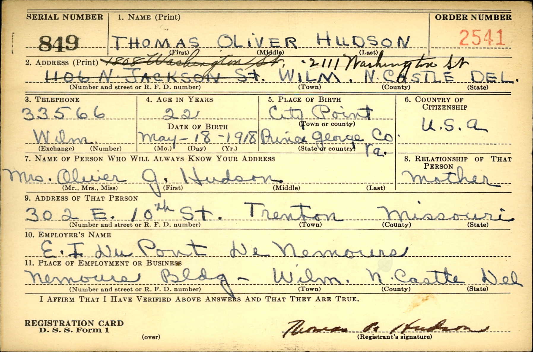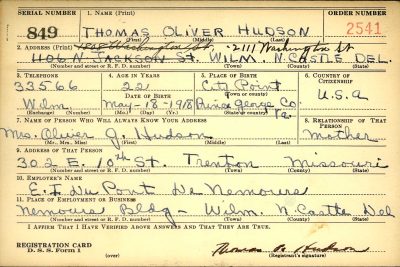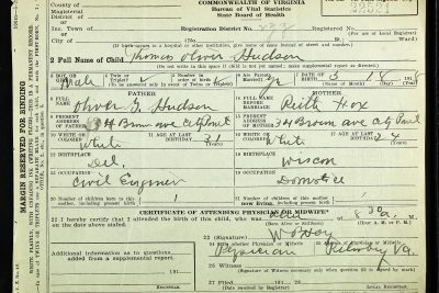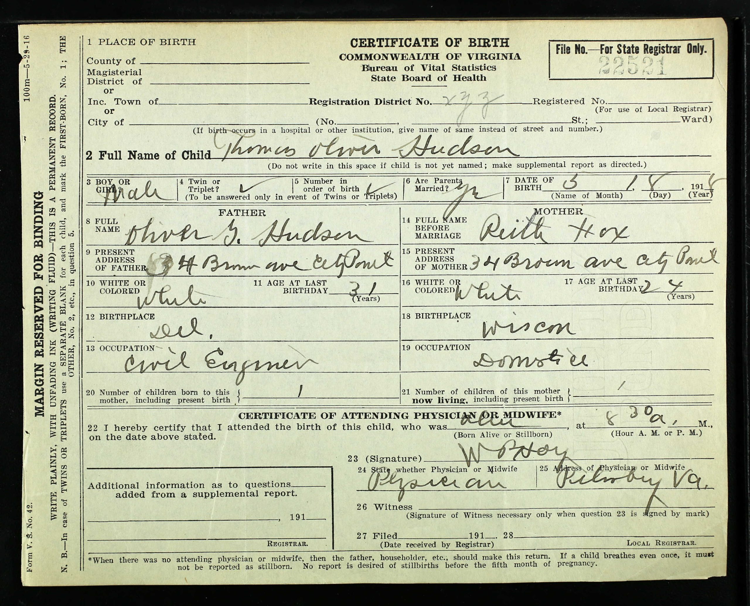 Thomas Oliver Hudson was born at Prince George, Virginia, the son of Oliver G. Hudson and Ruth Fox.