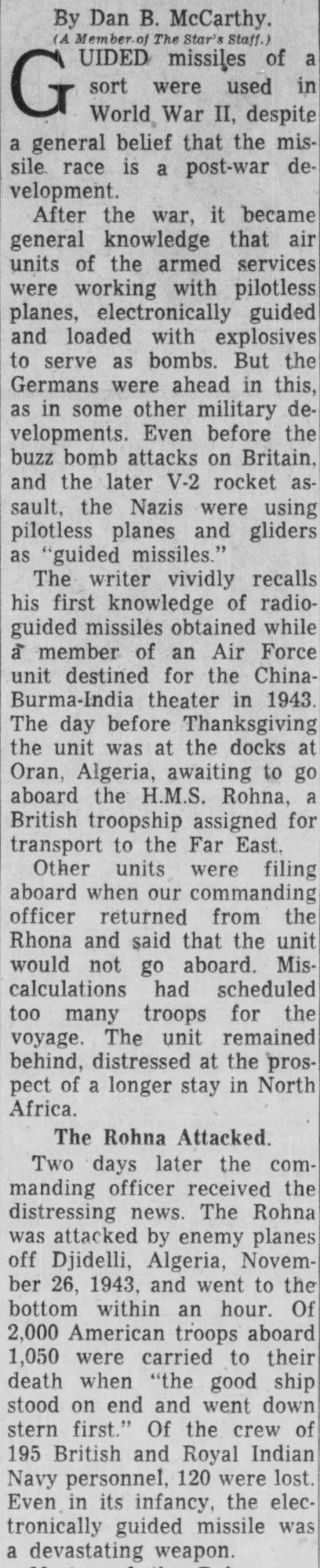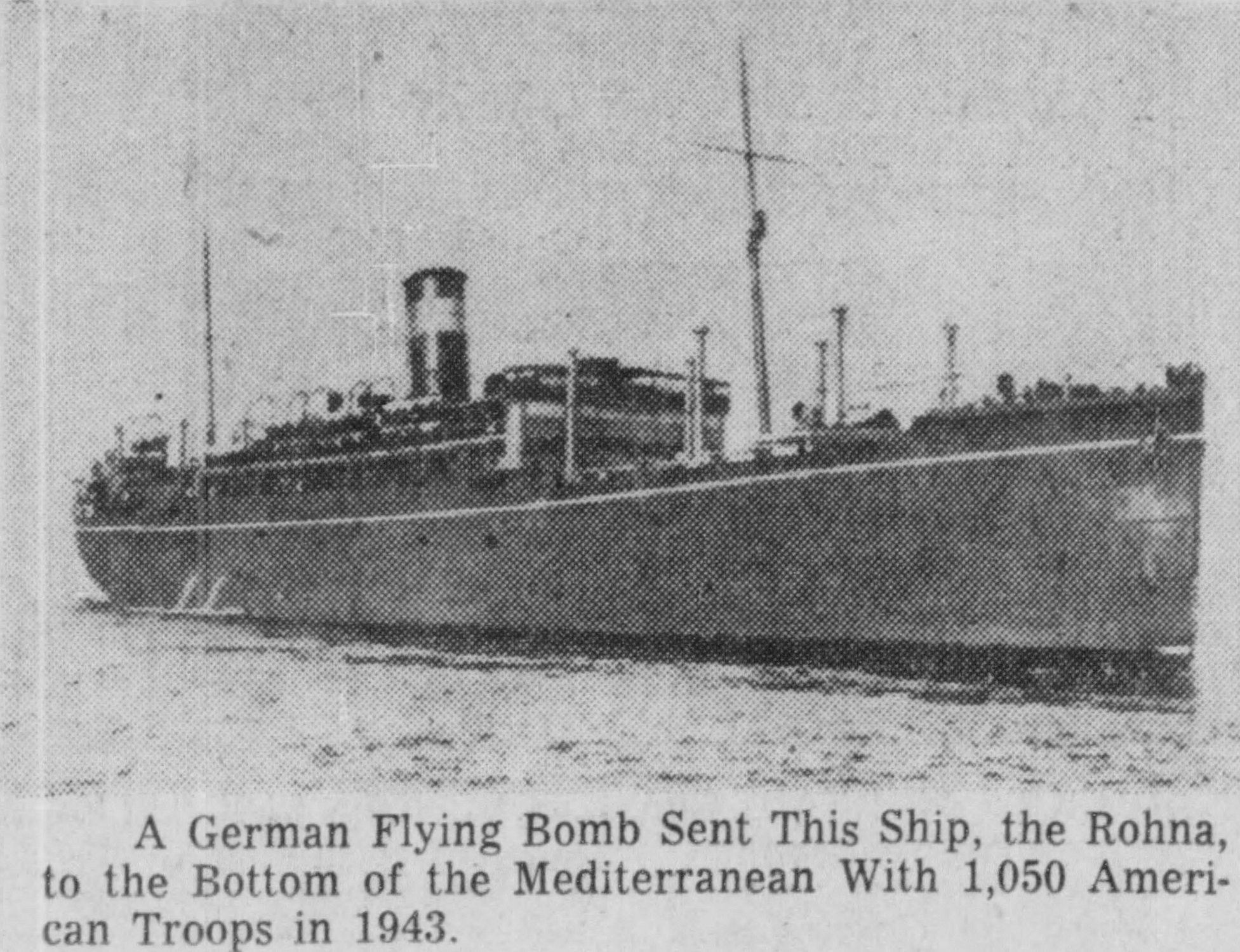 The HMT (Her Majesties Transport) Rohna was a British troop ship. On 26 november 1943, it was hit by a guided bomb shot from a German airplane, off Djidjelli, Algeria. The ship sank within one-half our after being hit. Bomb damage, supplemented by heavy seas and darkness which hampered rescue work, resulted in a loss of 1,015 men, more than half of the total 1,981 American military personnel aboard.