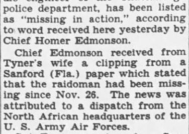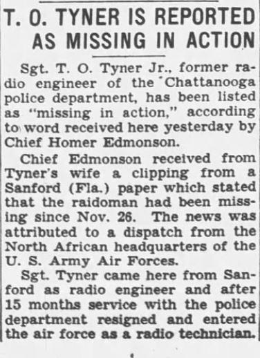 Sgt. T.O. Tyner Jr., former radio engineer of the Chattanooga police department, has been listed as “missing in action”, according to word received here yesterday by Chief Homer Edmonson. Chief Edmonson received from Tyner’s wife a clipping from a Sanford (Fla.) paper had been missing since Nov. 26. The news was attributed to a dispatch from the North African headquarters of the U.S. Army Air Forces. Sgt. Tyner came here from Sanford as radio engineer and after 15 months service with the police department resigned and entered the air force as a radio technician.
