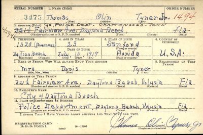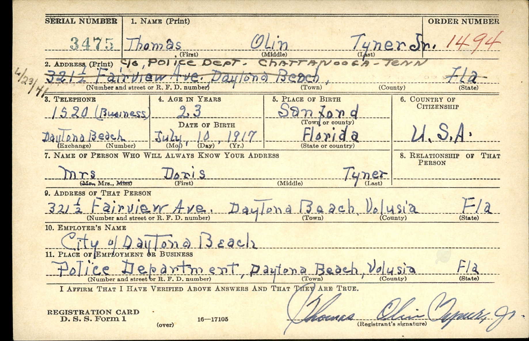 Thomas Olin Tyner was born at Sanford, Florida, the son of Thomas Olin Tyner and Mathilda Bengtsson. The husband of Doris Quattlebaum.