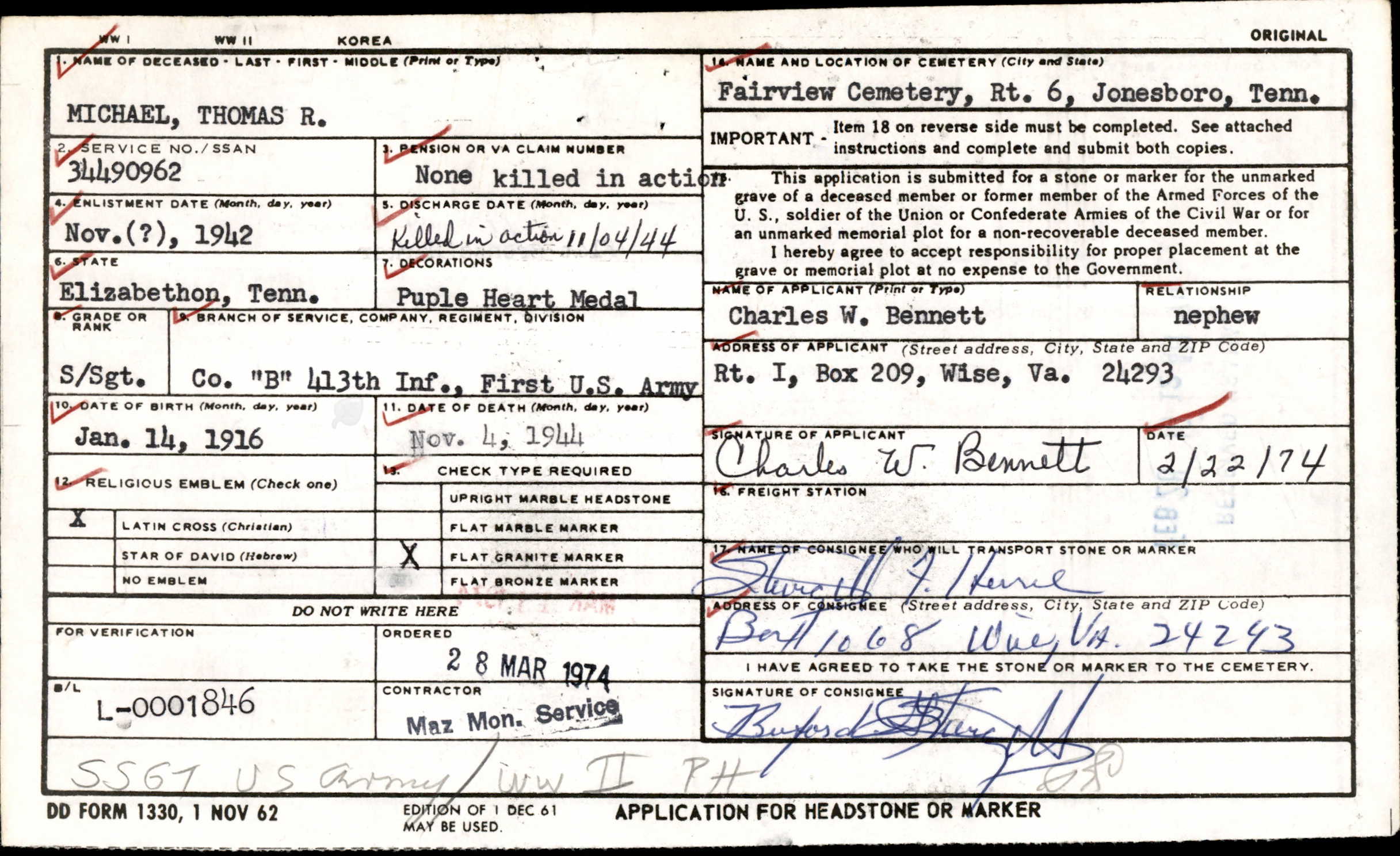 S/Sgt Michael is buried at Fairview United Methodist Church Cemetery at Jonesborough, Washington County, Tennessee.