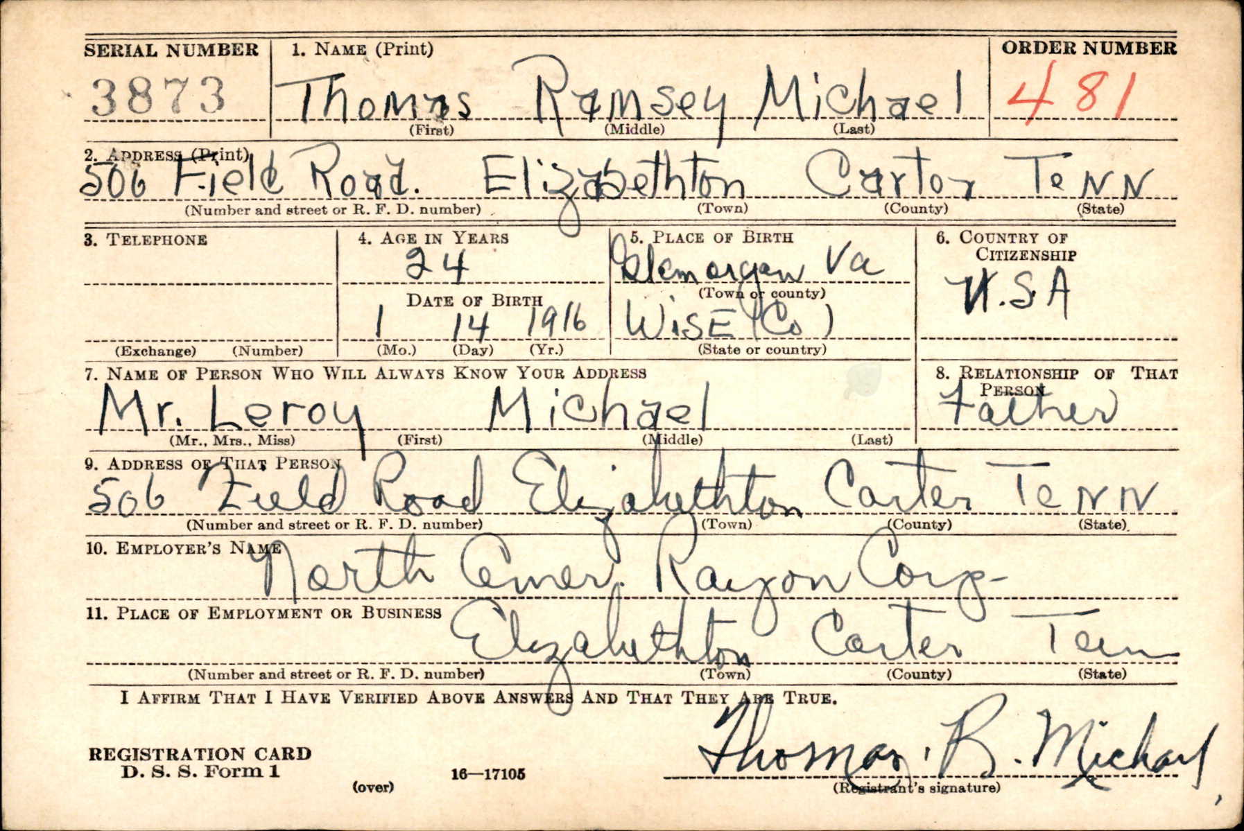 Thomas Ramsey Michael was born on 14 January 1916 in Glamorgan, Virginia, the son of Leroy Michael and Nancy Helen Bennett.