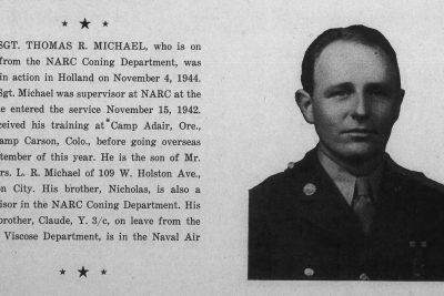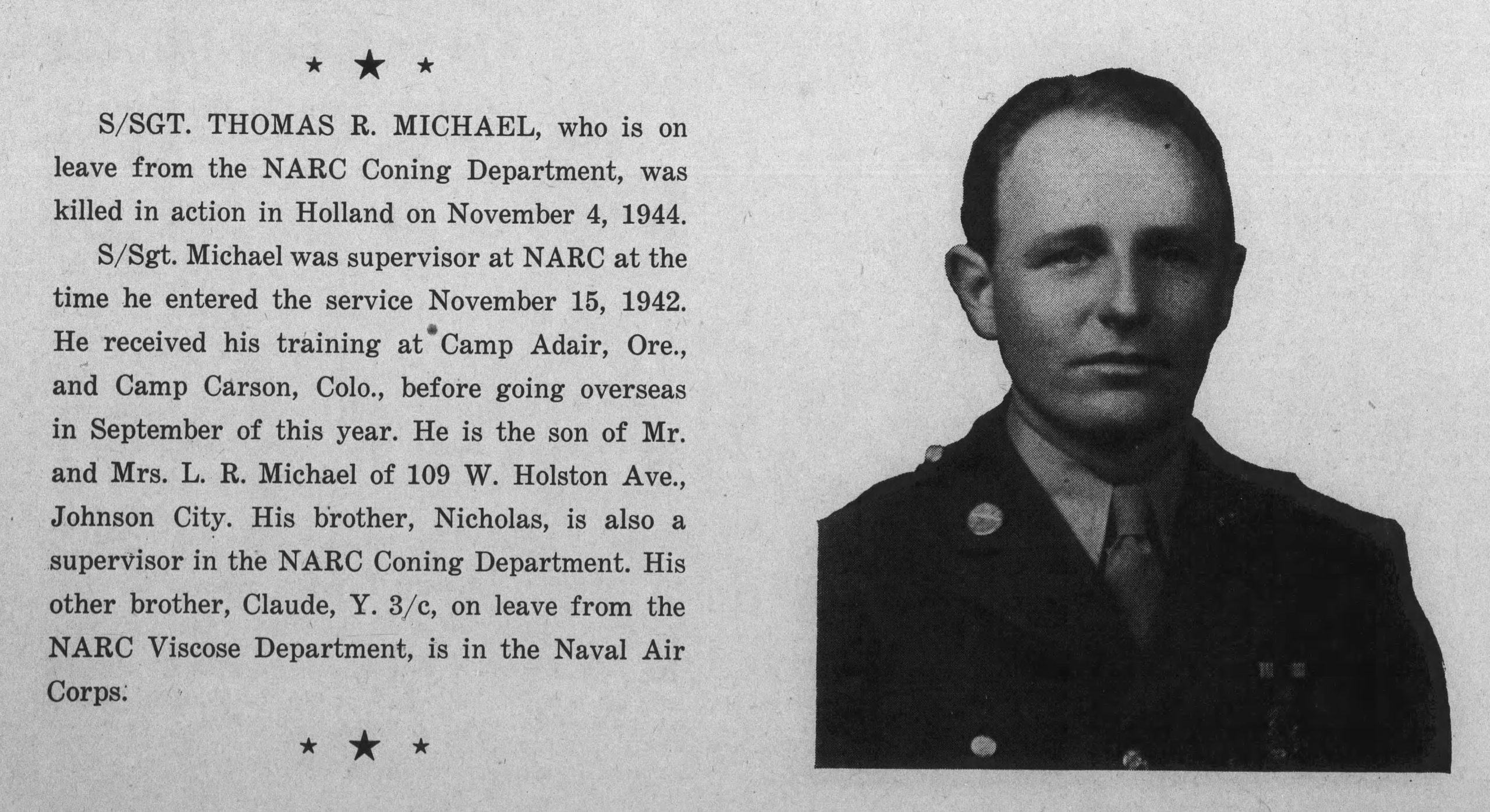 S/Sgt Thomas R. Michael, was killed in action in Holland on November 4, 1944. S/Sgt Michael was supervisor at NARC at the time he entered the service November 15, 1942. He received his training at Camp Adair, Ore., and Camp Carson, Colo., before going overseas in September of 1944. He is the son of Mr. and Mrs. L.R/ Michael of 109 W. Holston Ave., Johnson City. His brother, Nicholas, is also a supervisor in the NARC Coning Department. His other brother, Claude, Y 3/c served in the Naval Air Corps.