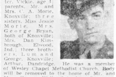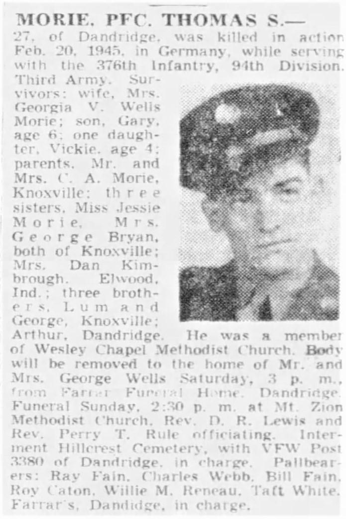 PFC Thomas S. Morie, 27, of Dandridge, was killed in action Feb. 20, 1945 in Germany while serving with the 376th Infantry, 94th Division, Third Army. Survivors: wife, Mrs. Georgia V. Wells Morie; one daughter, Vickie, age 4; parents, Mr. and Mrs. C.A. Morie, Knoxville; three sisters, Miss Jessie Morie, Mrs. George Bryan, both of Knoxville, Mrs. Dan Kimbrough, Elwood, Ind.; three brothers, Lum and George, Knoxville; Arthur Dandridge. He was a member of Wesley Chapel Methodist Church.