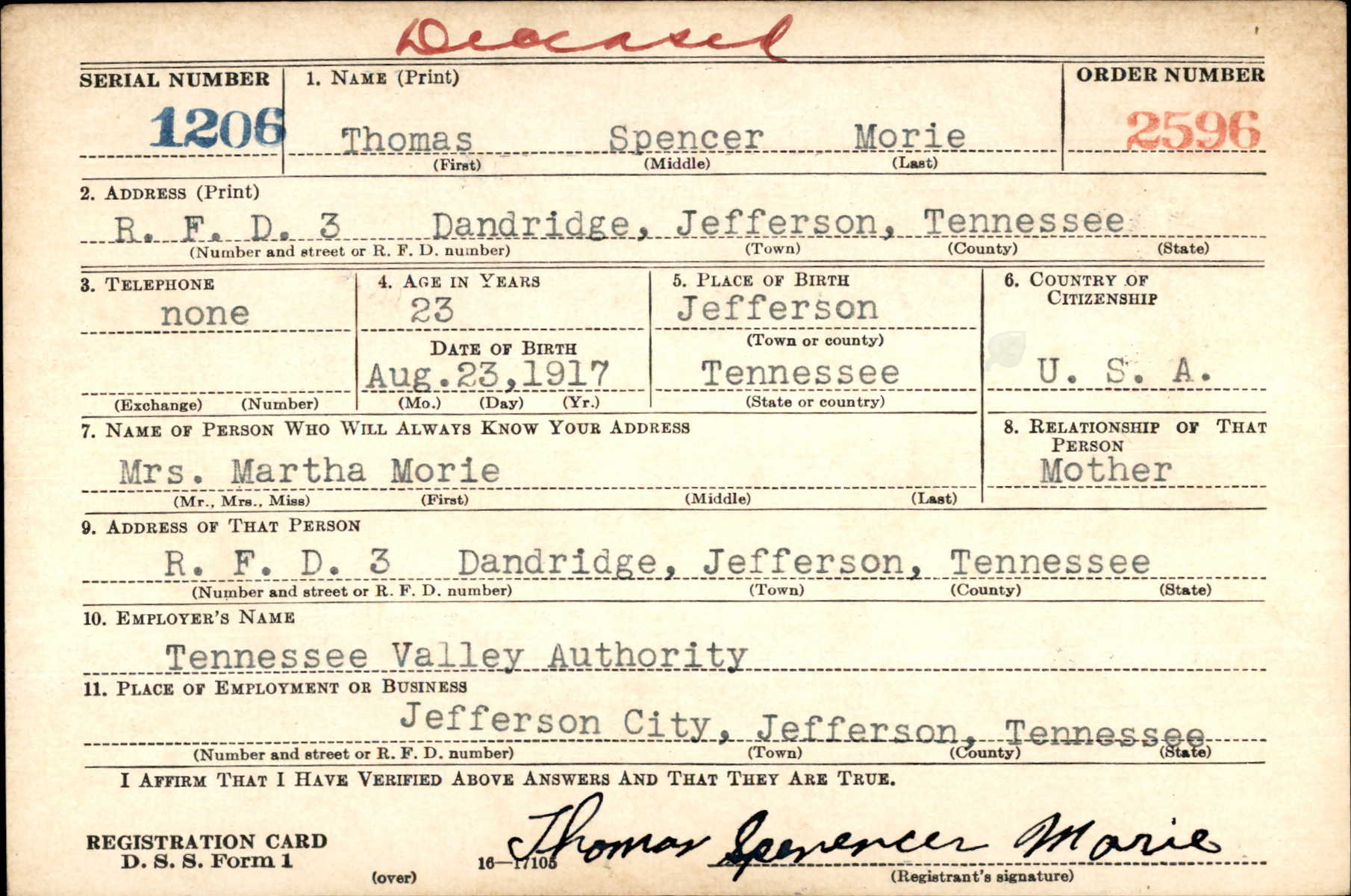 Thomas Spencer Morie was born on 23 August 1917 in Tennessee, the son of Charles Alfred Morie and Martha Elizabeth Henderson. Husband of Georgia Victoria Wells and father of Gary Lynn Morie and Vicki Morie.