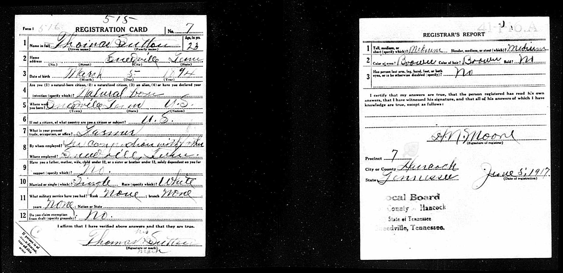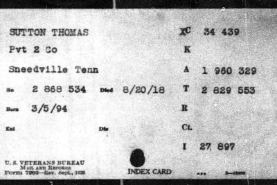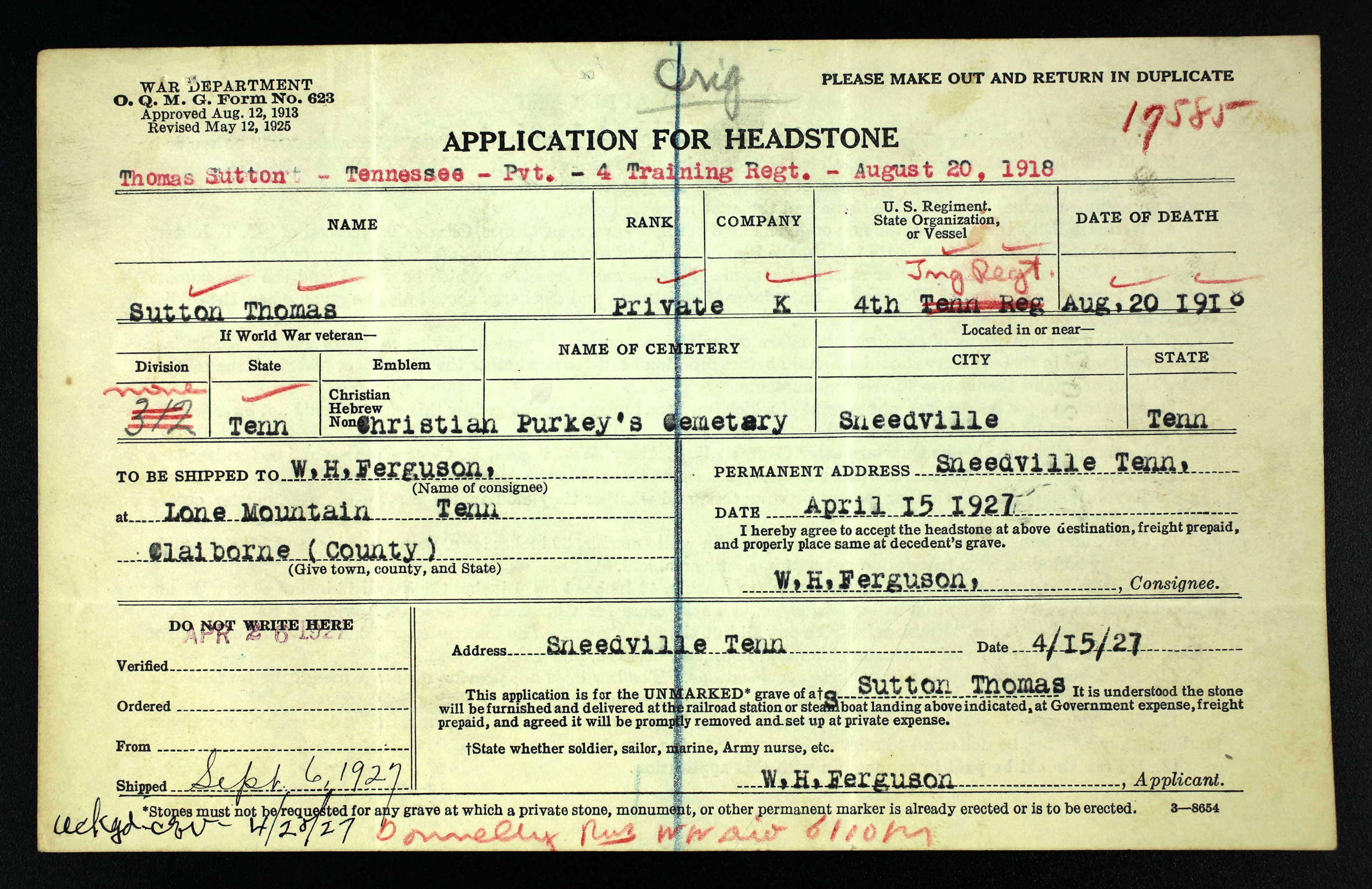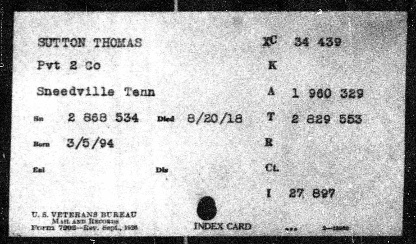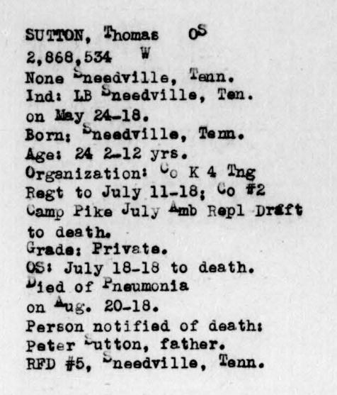 Thomas Sutton was the son of Peter Sutton and Emily J. Purkey. He died 20 August 1918 of pneumonia.