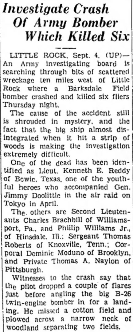 On September 2, 1942 at 11:15 pm, a B-26A bomber crashed near Pinnacle Mountain, seven miles northwest of Little Rock, Pulaski County, Arkansas. The six U.S. Army airmen aboard the plane took off at Barksdale, Louisiana on a cross-country routine flight. They were not scheduled to land in Adams Field, the main air field in Little Rock, Arkansas. The exact circumstances of the crash are unknown. However, a student under the direction of a Civilian Instructor at Adams field reported a radio message from an unidentified plane that was circling Adams Field and returning to Barksdale, Louisiana. Witnesses of the crash, claim that the pilot was traveling north along the Arkansas River before turning southwest. The B-26A aircraft crashed in a narrow strip of woods, one-quarter mile long near Pinnacle Mountain. The debris of the crash was scattered fifty yards wide and three hundred and fifty yards long over the site. The crash resulted in fatalities of all the men aboard the plane. The men that died in the crash were pilot Kenneth Reddy, 1st Lt., and co-pilot in the Doolittle Raid in Japan, Charles S . Brachbill 2nd Lt., Phillip Williams, 2nd Lt., Thomas T. Roberts Sgt., Dominic T. Moduno, Col., and Thomas A. Naylon, Pvt.