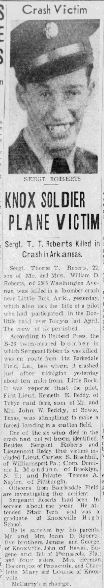 Sgt. Thomas T. Roberts, 22, son of Mr. and Mrs. William D. Roberts, 2505 Washington Avenue, who died with five companions in the bomber crash. Army authorities revealed that a B-26 twin-motored bomber crashed and burned in a hilly wooded section seven miles from Little Rock, instantly killing the crew of three officers and three enlisted men.