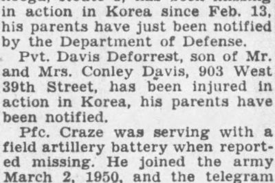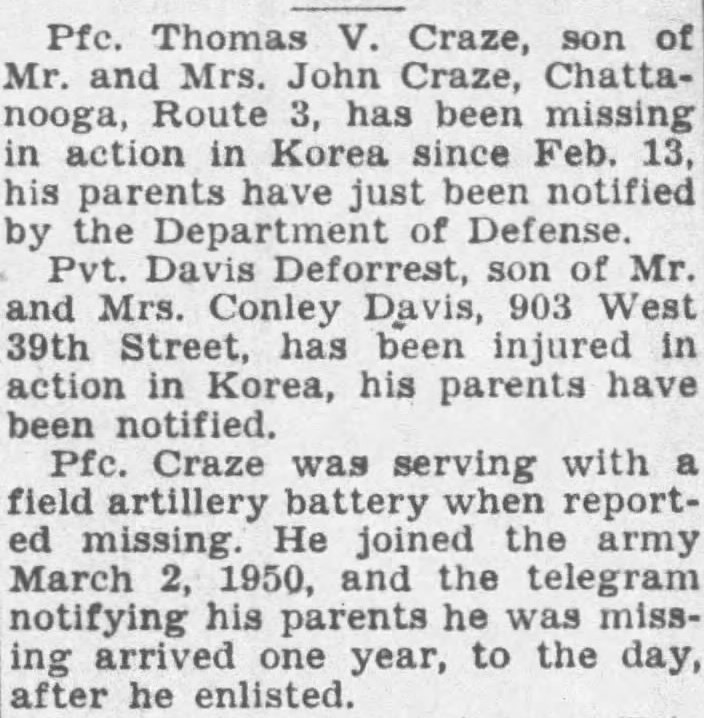 Pfc. Thomas V. Craze, son of Mr. and Mrs. John Craze, Chattanooga, Route 3, has been missing in action in Korea since Feb. 13, his parents have just been notified by the Department of Defense. Pfc. Craze was serving with a field artillery battery when reported missing. He joined the army March 2, 1950, and the telegram notifying his parents he was missing arrived one year, to the day, after he enlisted.