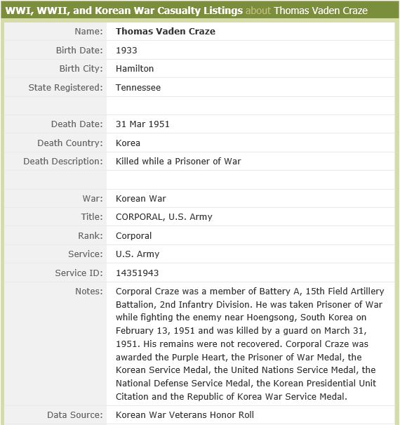 Corporal Thomas Vaden Craze was a member of Battery A, 15th Field Artillery Battalion, 2nd Infantry Division. He was taken prisoner of war while fighting the enemy near Hoengsong, South Korea, on February 13, 1951, and was killed by a guard on March 31, 1951. His remains were not recovered He is memorialized at Honolulu.