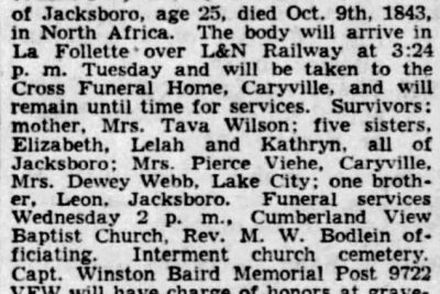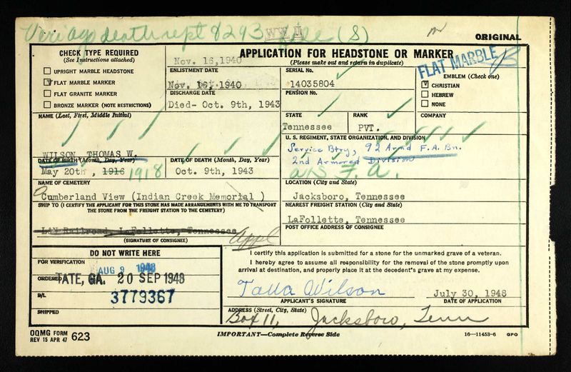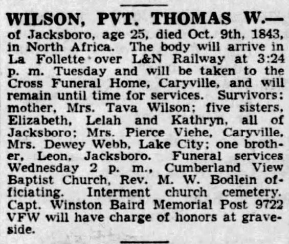 Thomas William Wilson was born on 20 May 1916 in Jacksboro, Tennessee, the son of John Matt Wilson and Latava “Tava”Alice Lindsey.