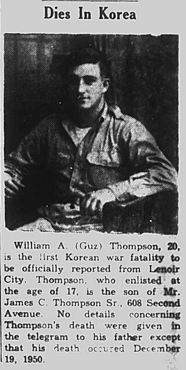 Private First Class Thompson was a member of Headquarters Company, 1st Battalion, 31st Infantry Regiment, 7th Infantry Division. He was listed as Missing in Action while fighting the enemy in Korea on December 19, 1950. He was presumed dead on December 31, 1953. He is memorialized at the National Korean War Veterans memorial in Washington, D.C.
