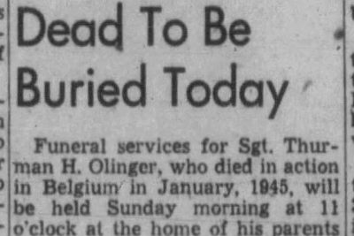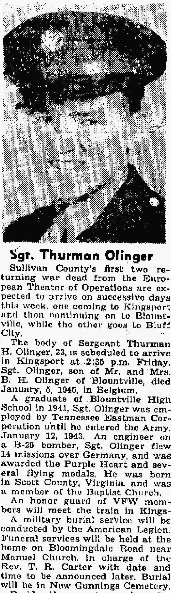 Sullivan County’s first two returning war dead from the European Theater of Operations are expected to arrive on successive days this week, one coming to Kingsport and then continuing to Blountville, while the other goes to Bluff City. The body of sergeant Thurman H. Olinger, 23, is scheduled to arrive in Kingsport at 2:35 p.m.. Sgt. Olinger, son of Mr. and Mrs. B.H. Olinger of Blountville, died January 5, 1945 in Belgium. A graduate of Blountville High school in 1941, Sgt Olinger was employed by Tennessee Eastman Corporation until he entered the Army January 12, 1943. An engineer on a B-26 bomber, Sgt Olinger flew 14 missions over Germany, and was awarded the Purple Heart and several flying medals. He was born in Scott County, Virginia and was a member of the Baptist Church. An honor guard of VFW members will meet the train in Kingsport. A military burial service will be conducted by the American Legion. Burial will be in New Gunnings Cemetery. Beside the parents, survivors include a brother, Arthur V. Olinger of Blountville, and three sister, Miss Madeline Olinger and Mrs. Opal Hooker, Blountville and Mrs. Elizabeth Clarke, Brookville, Ohio.