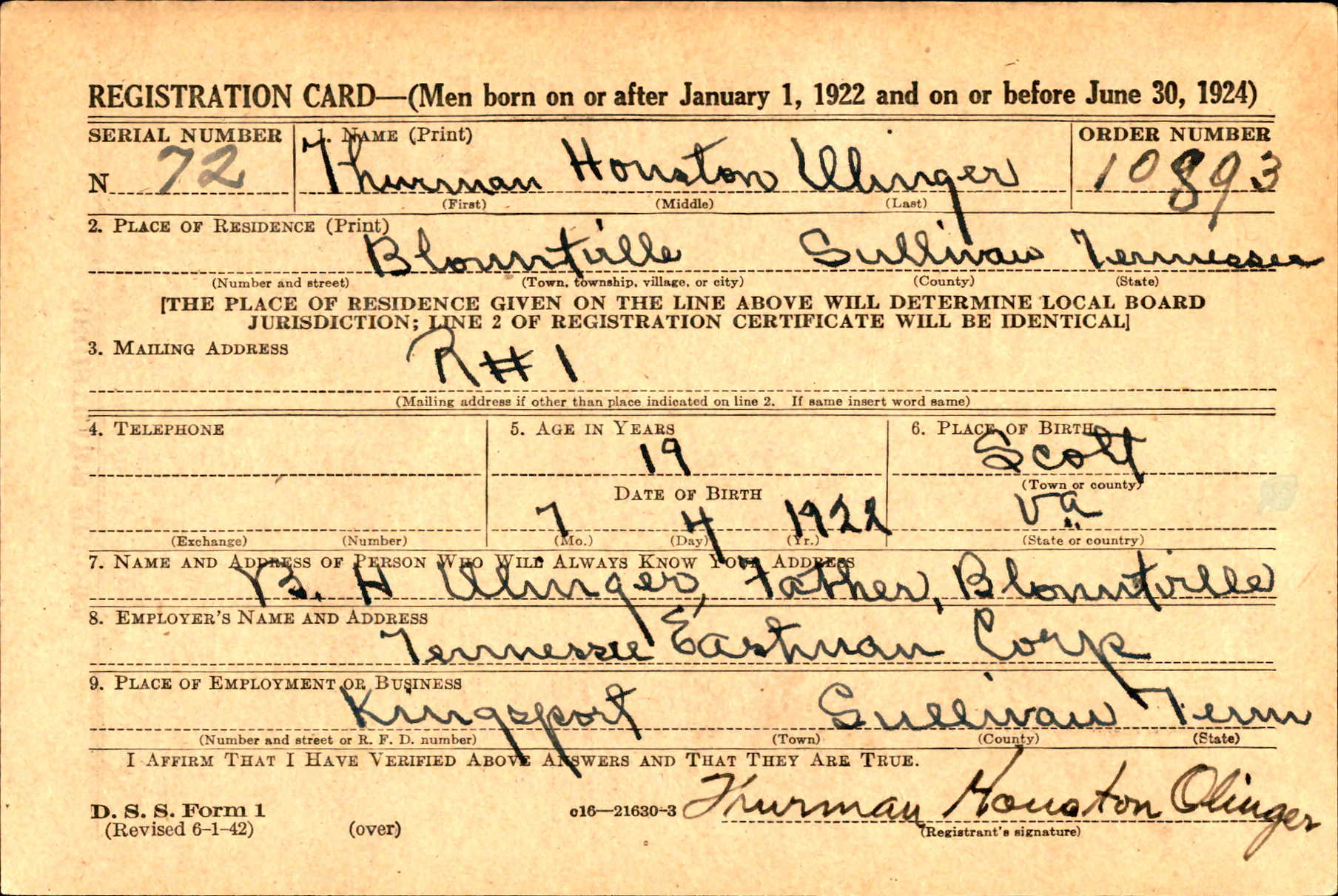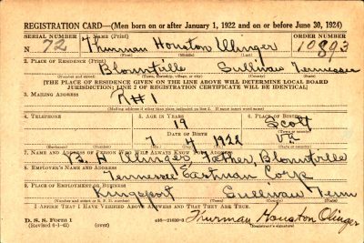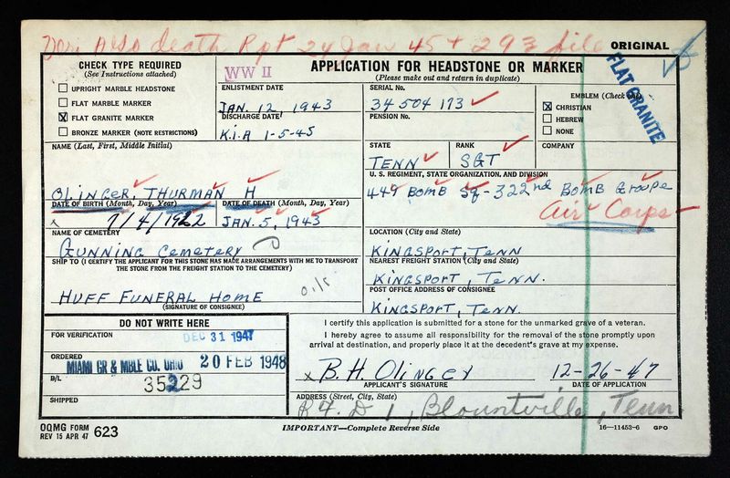 Thurman Houston Olinger was born on 4 July 1922 in Scott County, Virginia. He was the son of Benjamin Harrison Olinger and Ida Fannie Jane McMurray. He enlisted 5 January 1943 in Fort Oglethorpe, Georgia