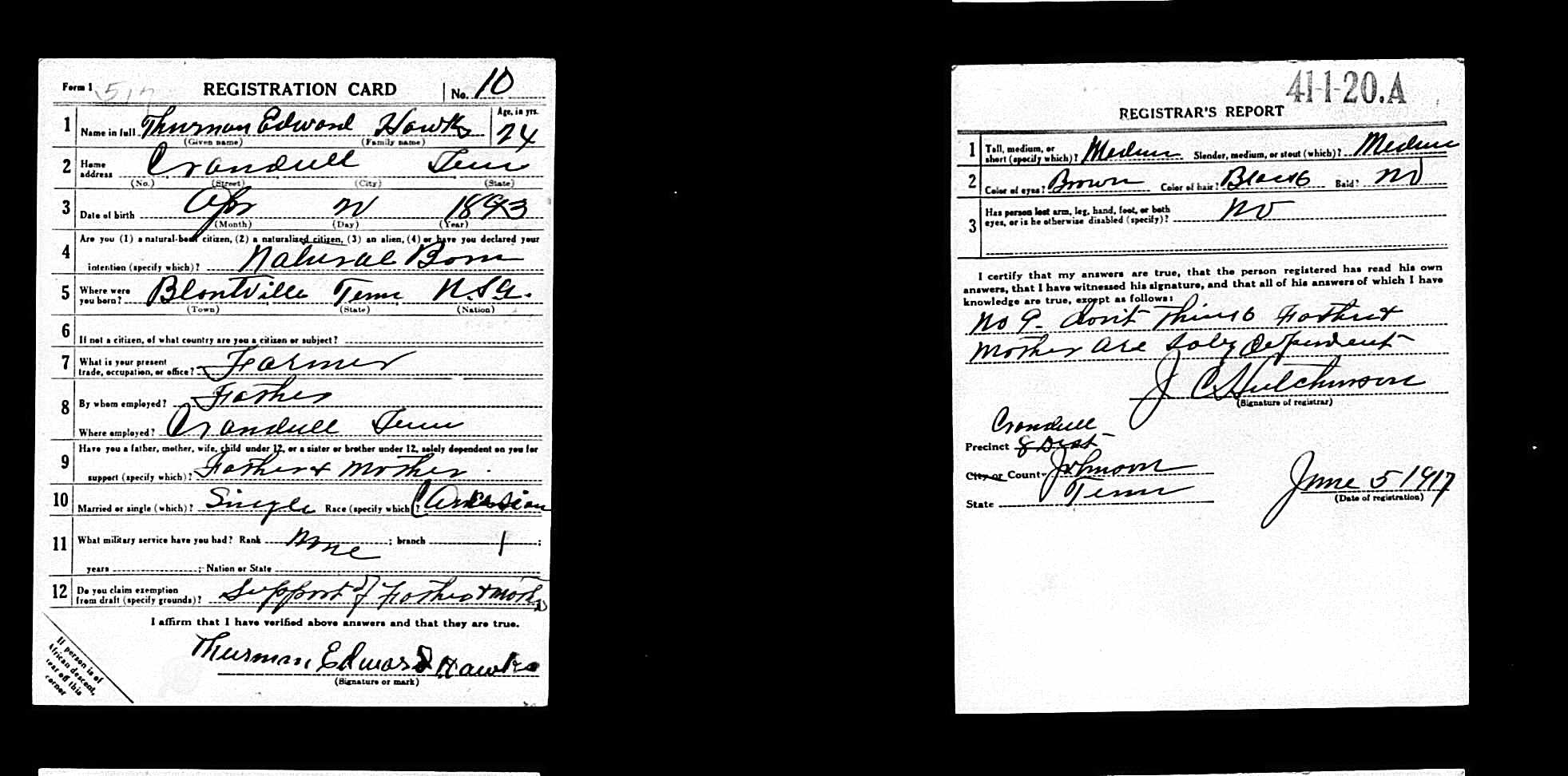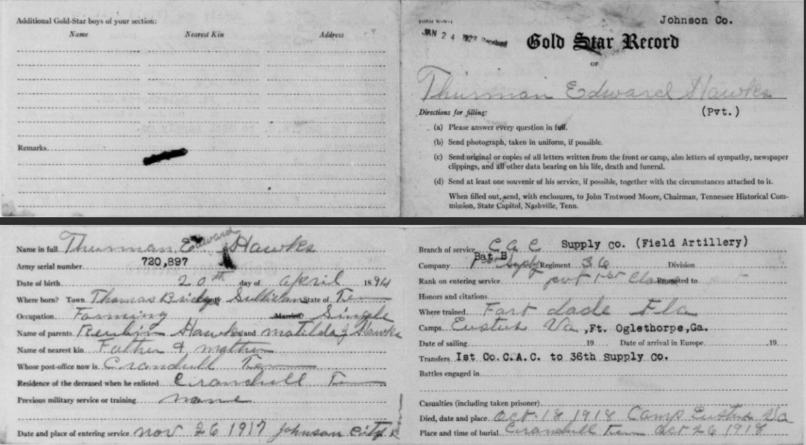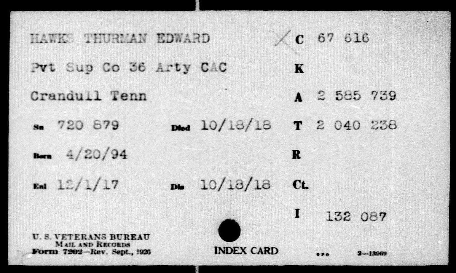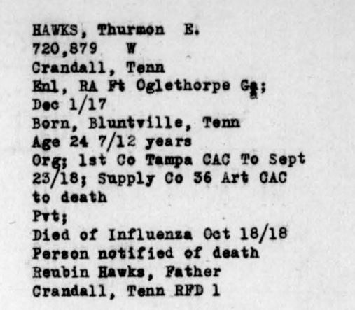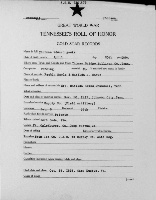 Thurmon (also Thurman) Edward Hawks was born 20 April 1893, Blountville, Tennessee, son of Reuben Edward Hawks and Matilde Jane Lyons. He trained at Fort Dade in Florida, Fort Oglethorpe in Georgia and died of influenza at Camp Eustus, Virginia.