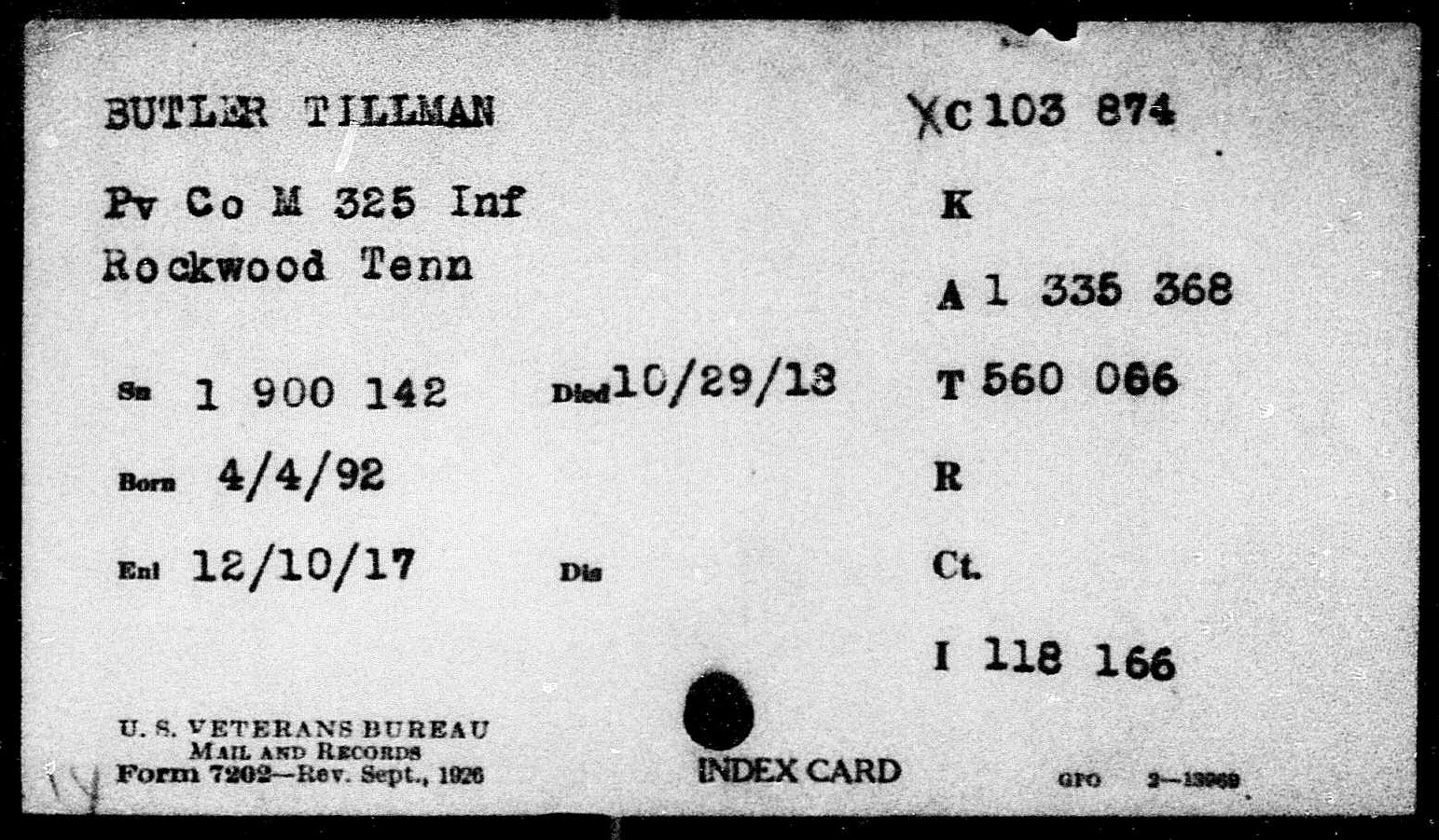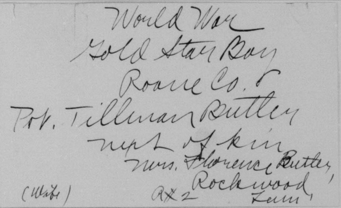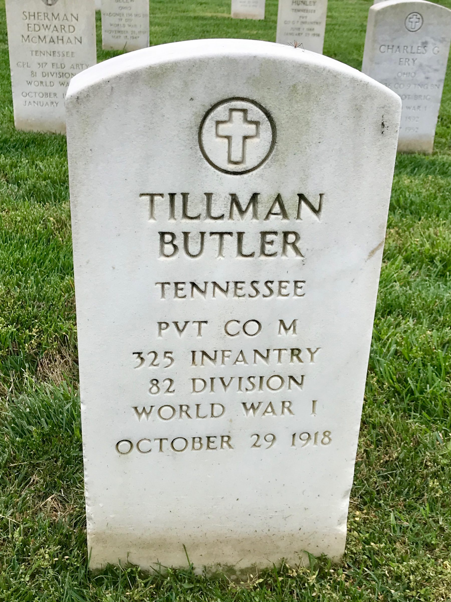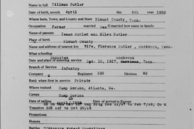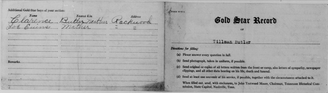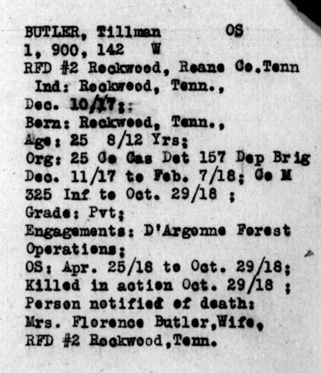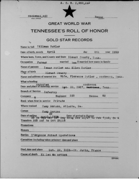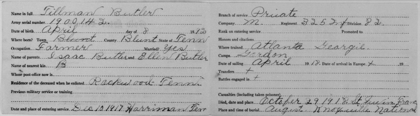 Tillman Butler inducted into service on 10 December 1917 at Camp Gordon, Georgia. He was killed in action at St. Juvin in France and initially buried at the American Cemetery, Romagne-sous-Montfaucon, Meuse.