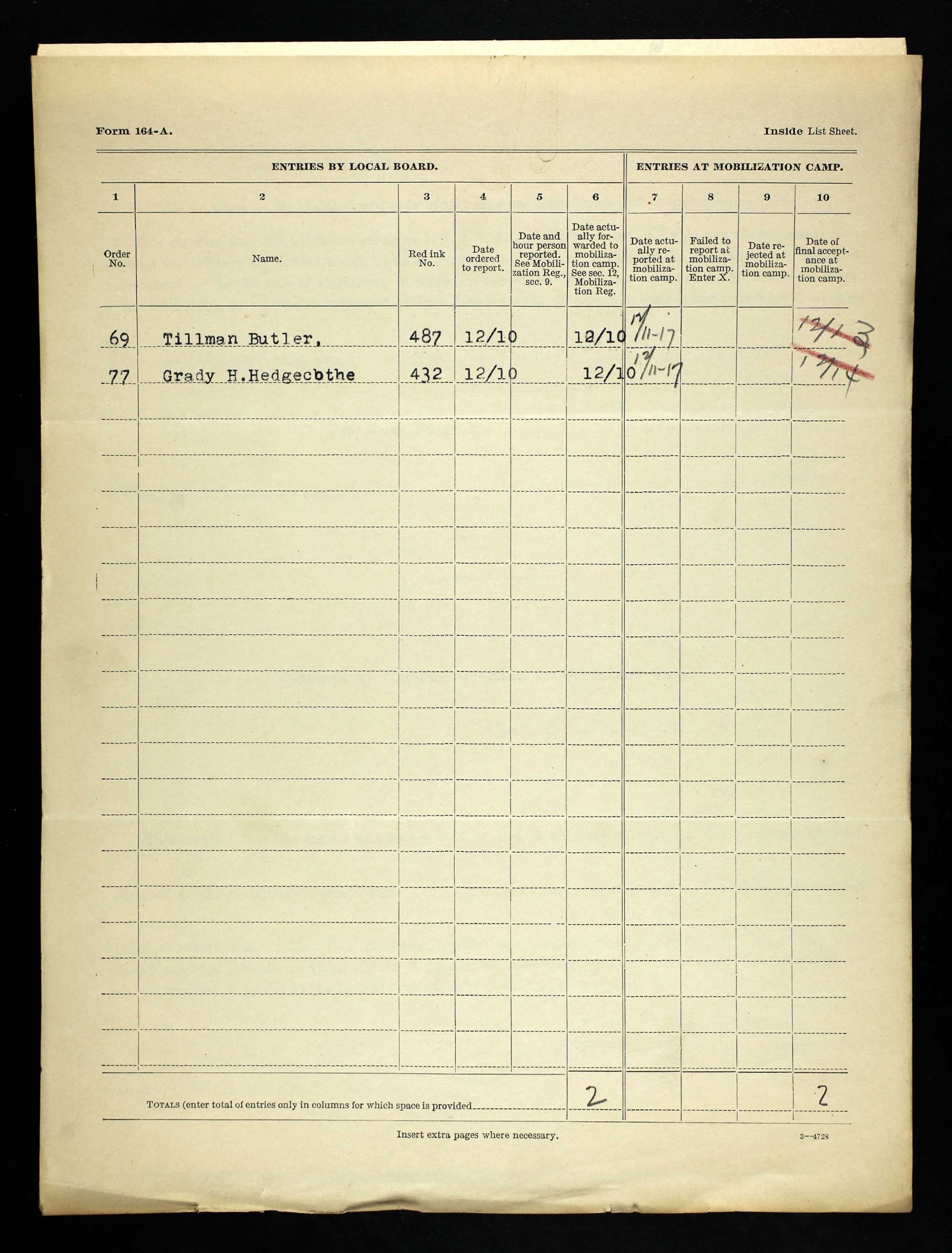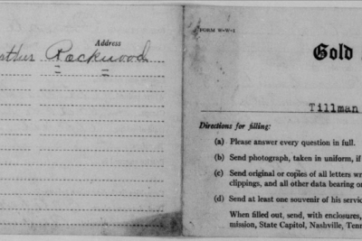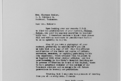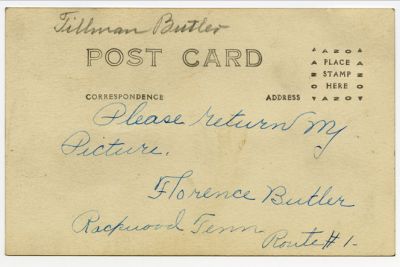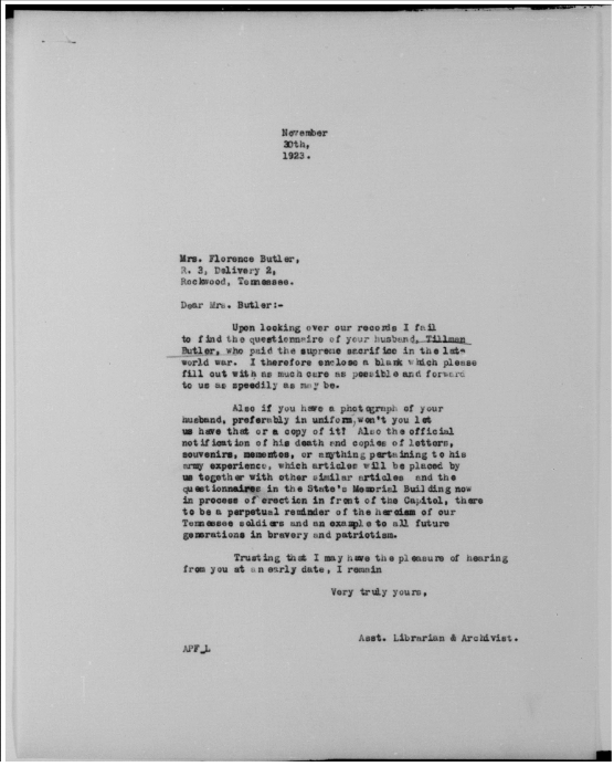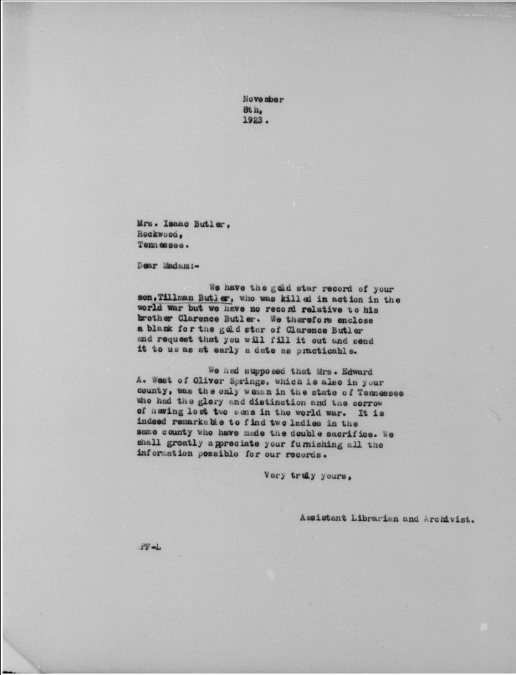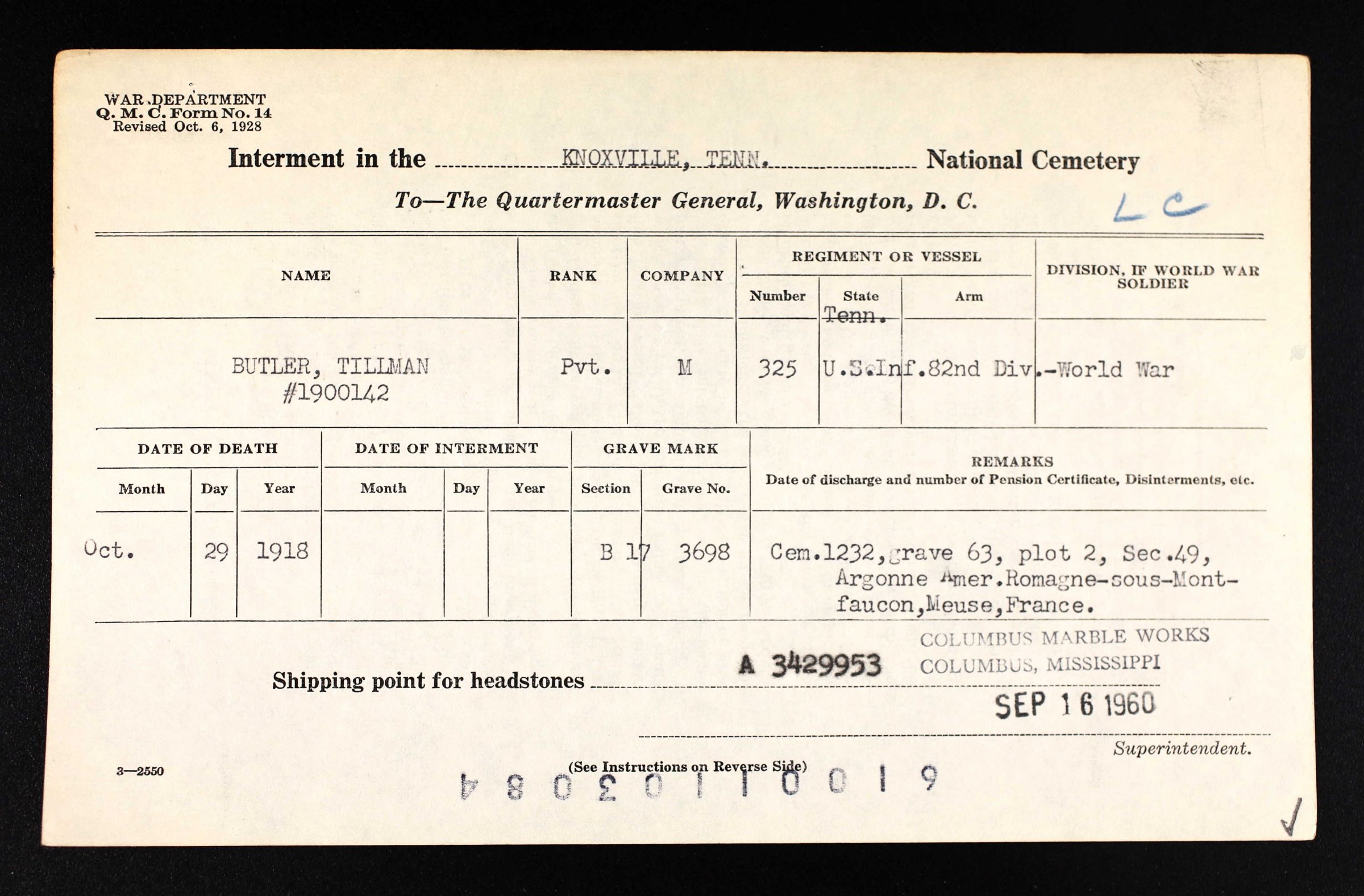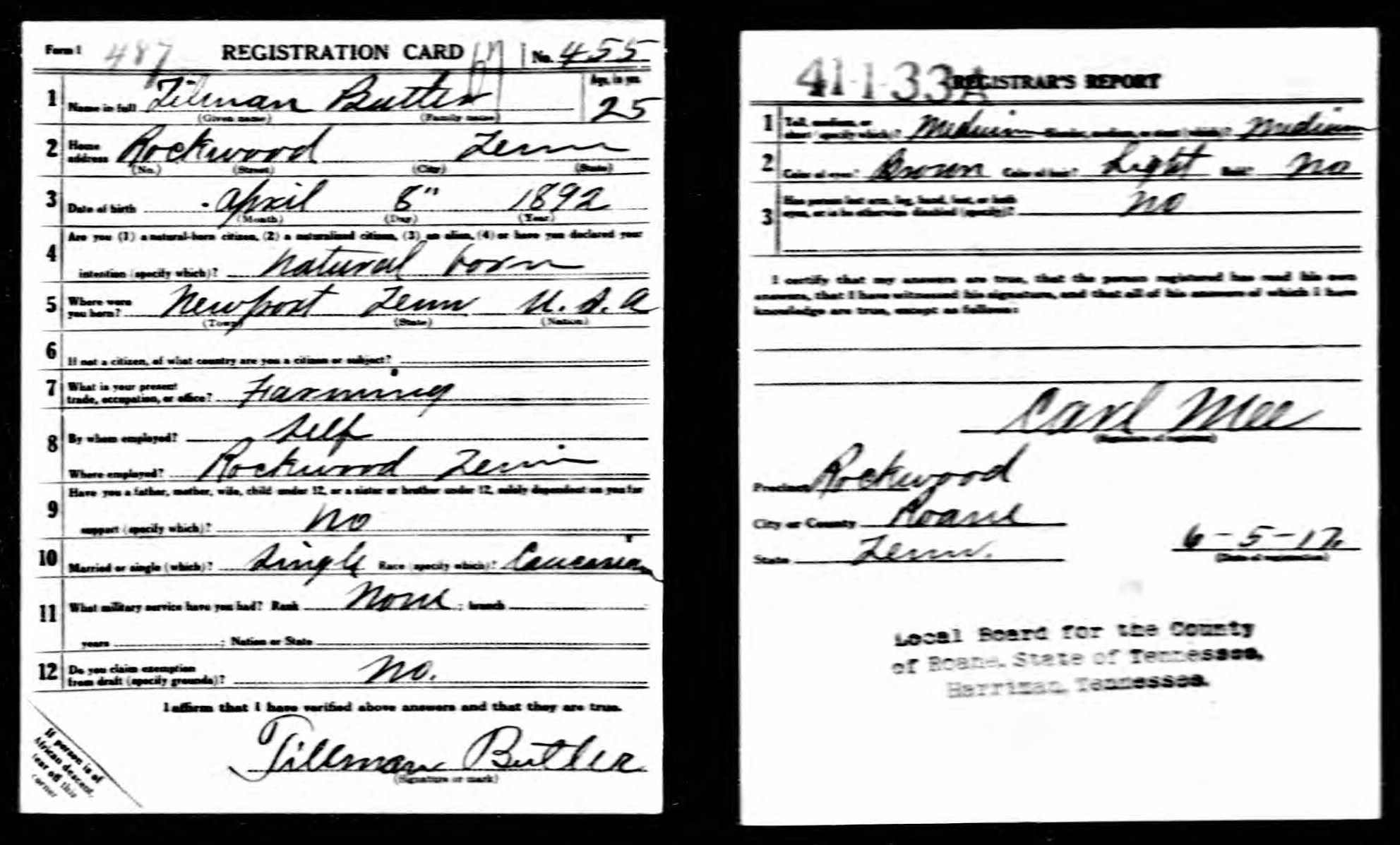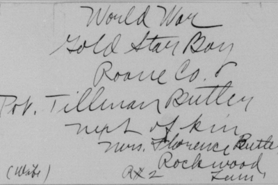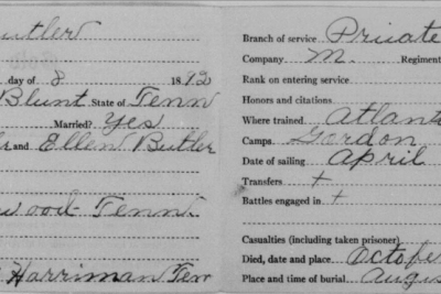 Tillman Butler inducted into service on 10 December 1917 at Camp Gordon, Georgia. He was killed in action at St. Juvin in France and initially buried at the American Cemetery, Romagne-sous-Montfaucon, Meuse.