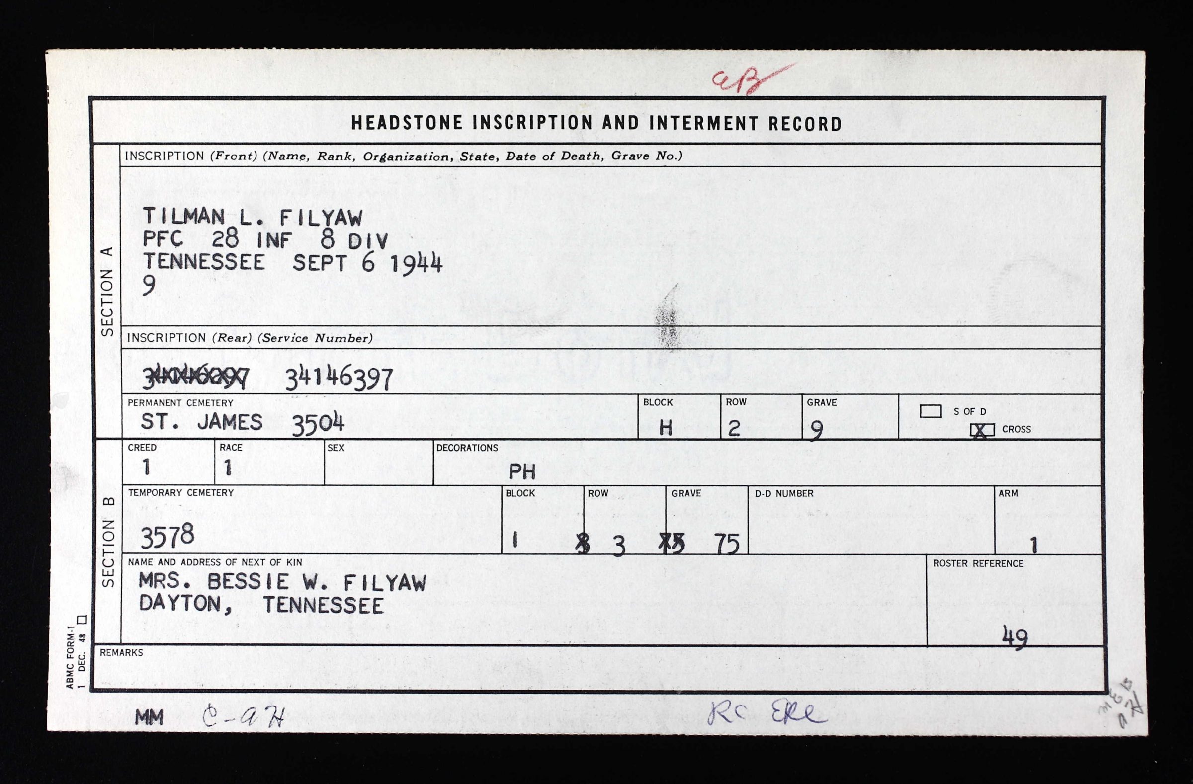 PFC Filyaw was killed in action on the 6th of September 1944. He is interred in the Brittany American Cemetery, H,2,9, St James, France. Awards include the Purple Heart.
