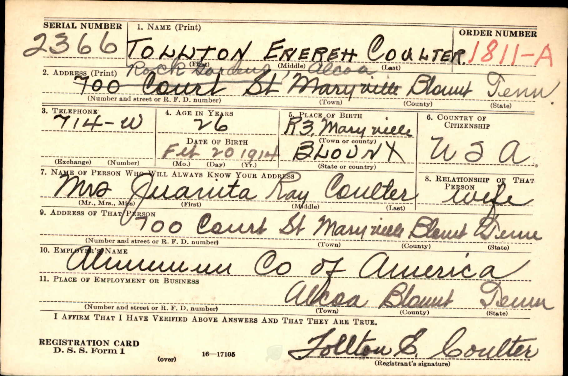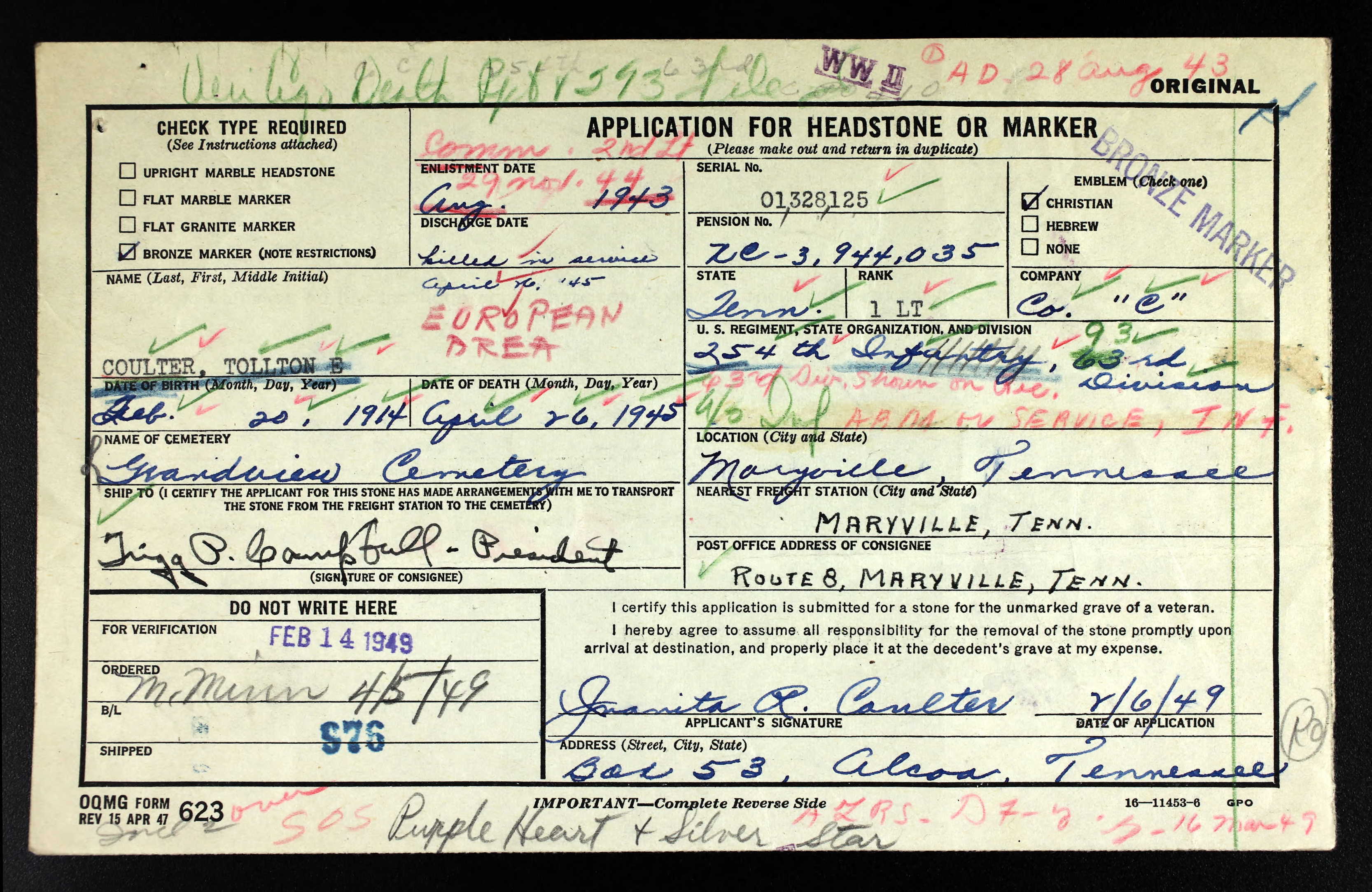 The President of the United States of America, authorized by Act of Congress July 9, 1918, takes pride in presenting the Silver Star (Posthumously) to First Lieutenant (Infantry), [then Second Lieutenant] Tollton F. Coulter (ASN: 0-1328125), United States Army, for gallantry in action while serving with Company C, 254th Infantry Regiment, 63d Infantry Division, in action on 19 March 1945, in the vicinity of Frisheim, Germany. During the attack on the Siegfried Line, Lieutenant Coulter’s company had the mission of taking eleven pillboxes. Lieutenant Coulter remained in the open directing fire of supporting tanks on the first pillbox and led the assault on the next four, capturing twenty-seven prisoners. With the aid of an English speaking prisoner, Lieutenant Coulter and two of his men entered each of the remaining pillboxes and captured a total of one hundred and ten prisoners. Lieutenant Coulter’s outstanding gallantry under hazardous conditions, is in keeping with the finest traditions of the Armed Forces of the United States.