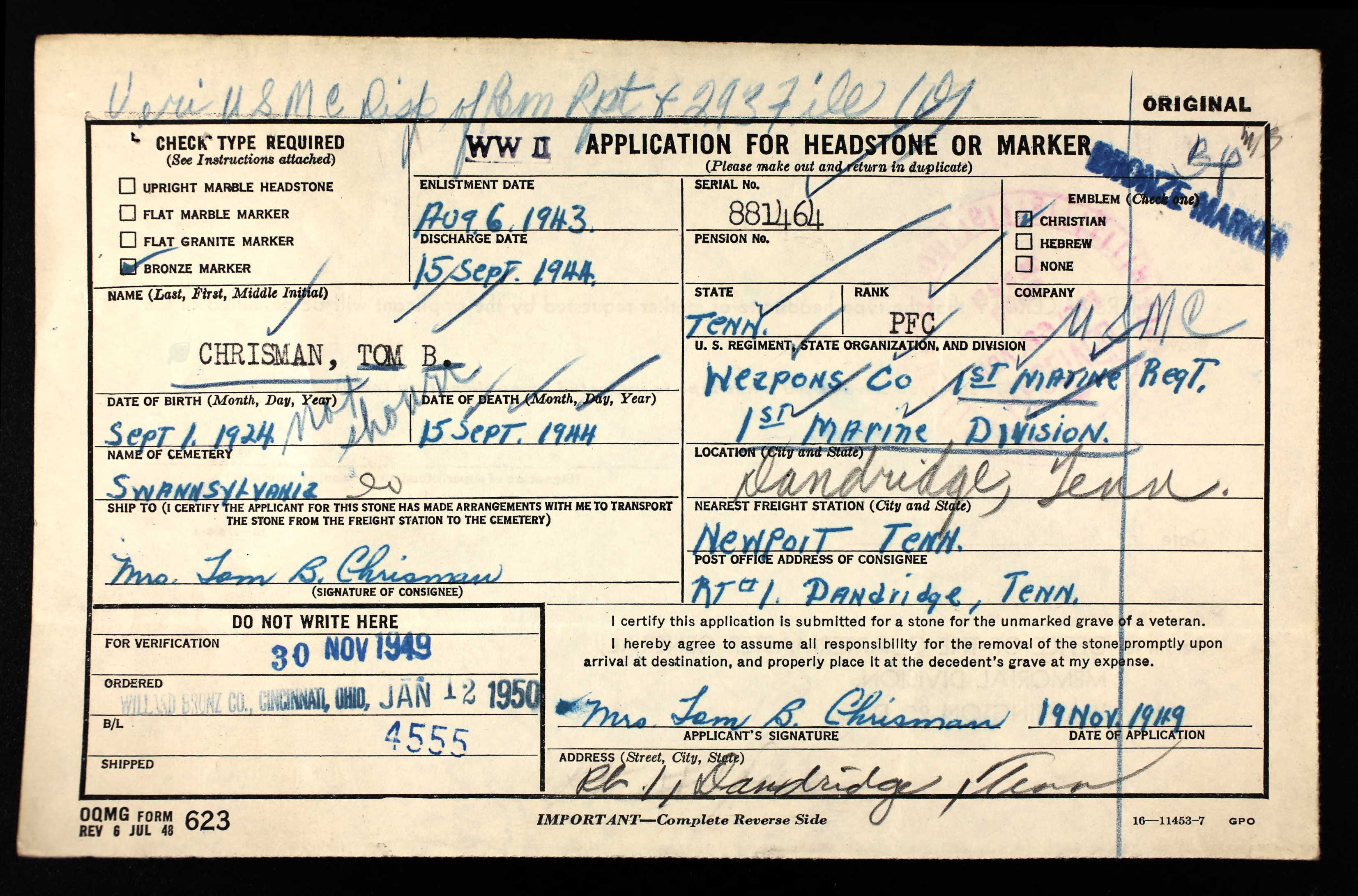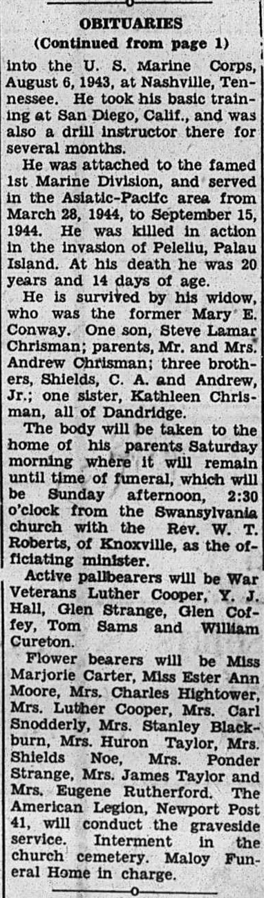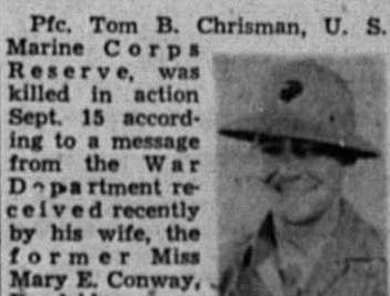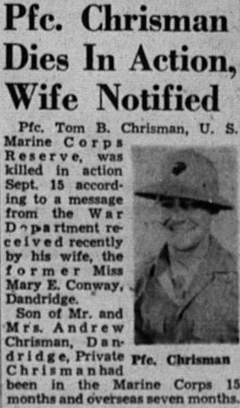 Tom Chrisman was a Marine who volunteered in the highest tradition of his native state to serve in a time of great conflict. He had just married his young wife when he was deployed to the Pacific and waded into the hell that was Peleliu Island in September of 1944. His young wife never remarried and passed into eternity with Tom seventy-two years later. All that remains is his name, etched into the smooth granite face of a stone column that protects it for anyone who wishes to see, remember and honor in the quiet and solitude of their thoughts.