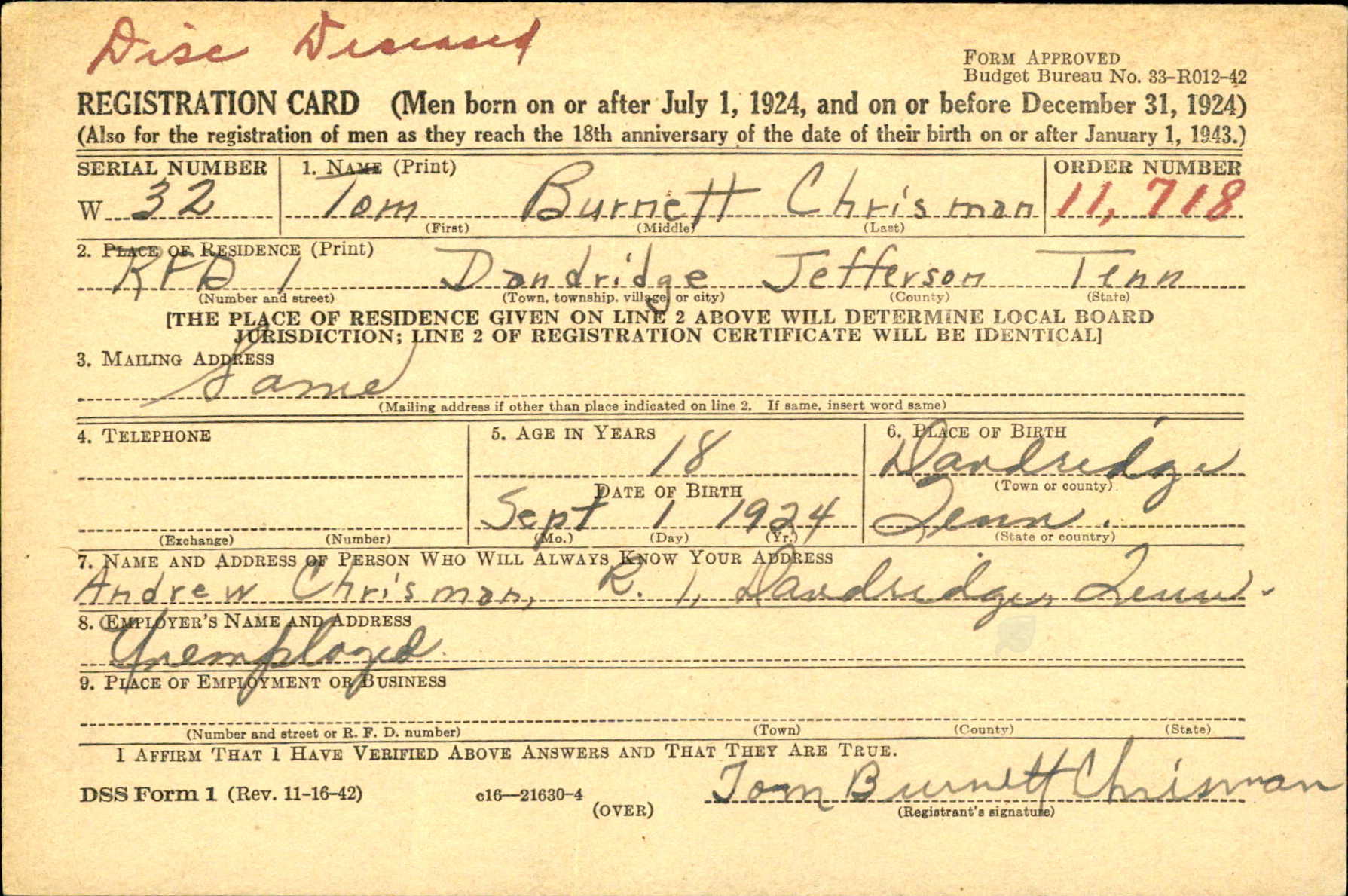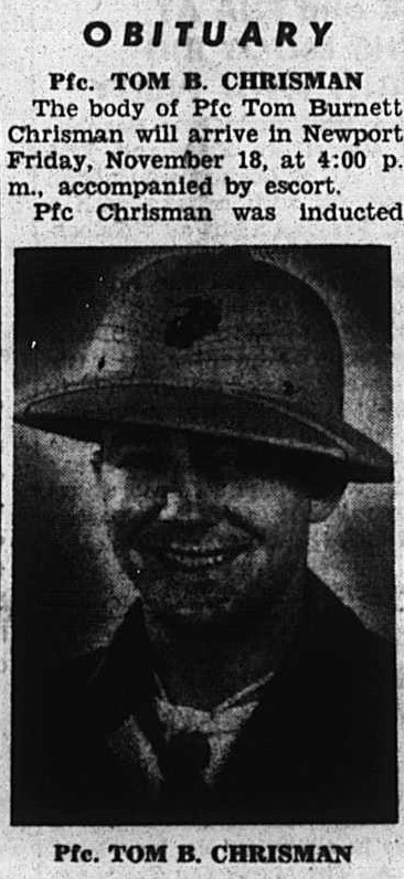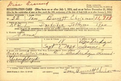 Tom Burnett Chrisman was born on 1 September 1924 in Jefferson County, Tennessee. Son of Andrew R Christman and Elizabeth Edmonds. Husband of Mary Elizabeth Conway