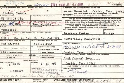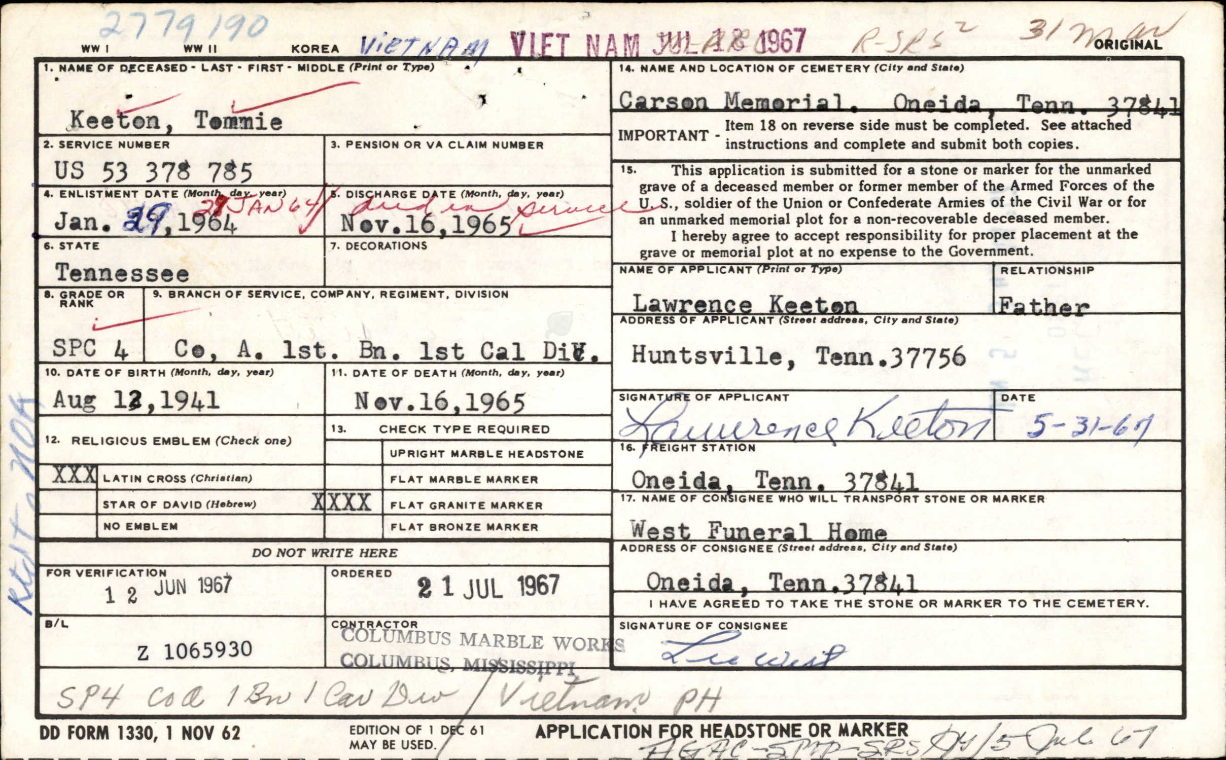 Funeral services for Sgt. Tommy Keeton, 24, who was killed in action in Vietnam on Nov. 17, were held at 2 p.m. Wednesday, December 1, from the West and Son Chapel with Rev. C. J. Thompson officiating. American Legion Post No. 136 was in charge of Military services at the grave. Interment followed in the Carson Memorial Park. West and Son in charge of arrangements. He is survived by his parents, Mr. and Mrs. Lawrence Keeton, Huntsville, Tenn. 5 brothers, Lillard, Delmer, David, Jackie and Douglas Dillard Keeton, all of Huntsville, Tenn. 1 sister, Lucille Keeton, Huntsville, Tennessee. Several Aunts and Uncles. Source Scott County News, 3 Dec 1965