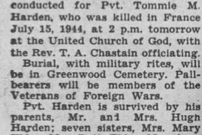 Military funeral rites will be conducted for Pvt. Tommie M. Harden, who was killed in France July 15, 1944 at the United Church of God. Burial, with military rites, will be in Greenwood Cemetery.