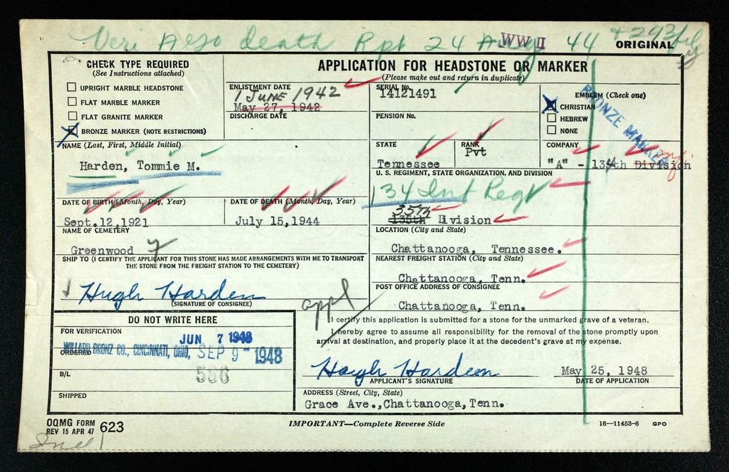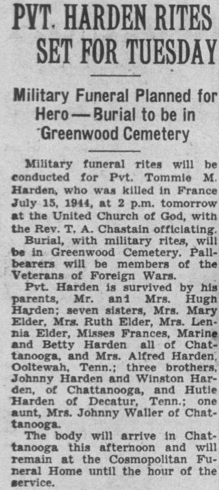 Pvt. Harden is survived by his parents, Mr. and Mrs. Hugh Harden; seven sisters, Mrs. Mary Elder, Mrs. Ruth Elder, Mrs. Lennia Elder, Misses Frances, Marine and Betty Harden all of Chattanooga and Mrs. Alfred Harden, Ooltewah, Tenn.; three brothers, Johnny Harden and Winston Harden, of Chattanooga, and Hutie Harden of Decatur, Tenn.; one aunt, Mrs. Johnny Waller of Chattanooga. The body will arrive in Chattanooga this afternoon and will remain at the Cosmopolitan Funeral Home until the hour of the service.