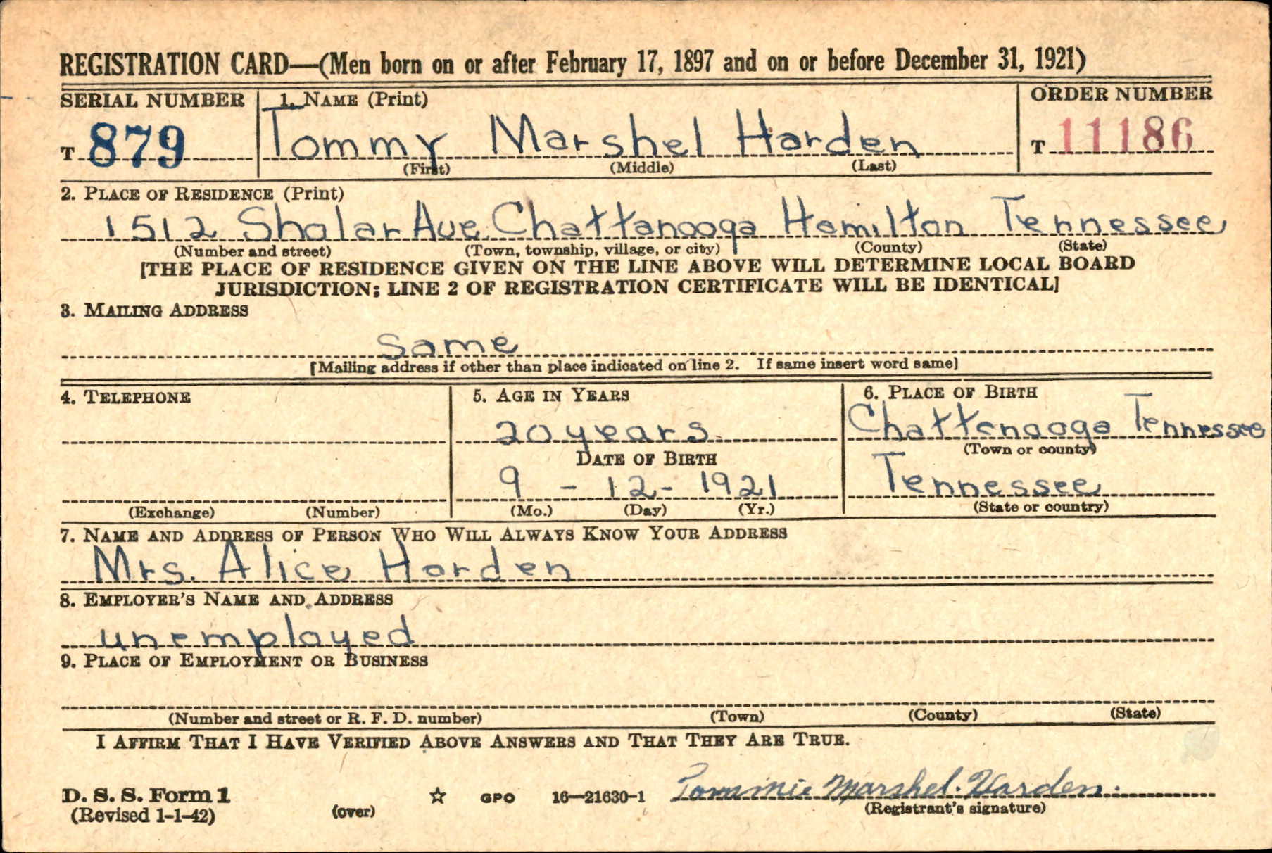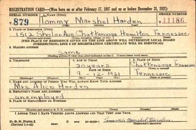 Tommie Marshel Harden was born on 12 September 1921 at Chattanooga, Tennessee to William Hugh Harden and Alice Harmon.