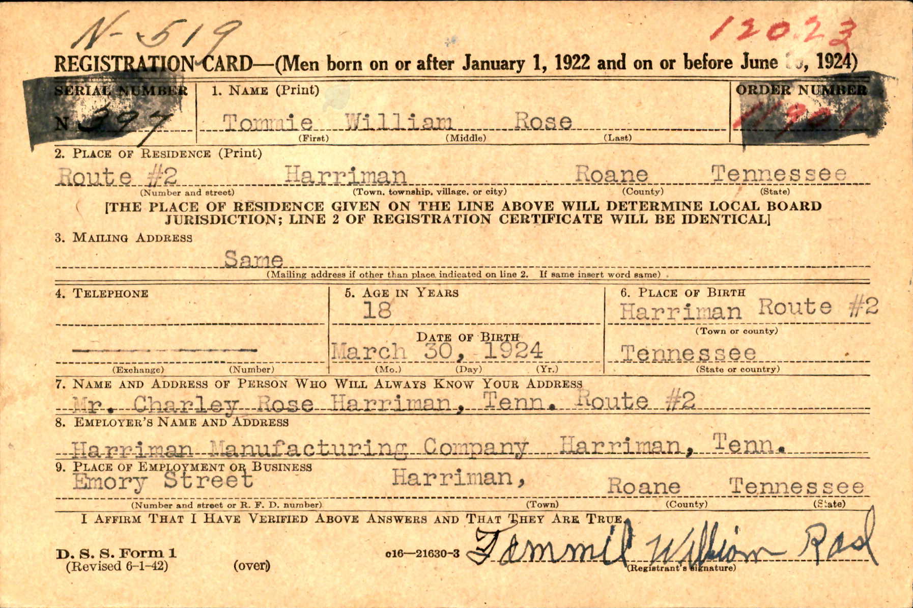 Tommie William Rose was born in Harriman, Tennessee. He was the son of Charlie Napolian Rose and Sarah Eliza Tapp.