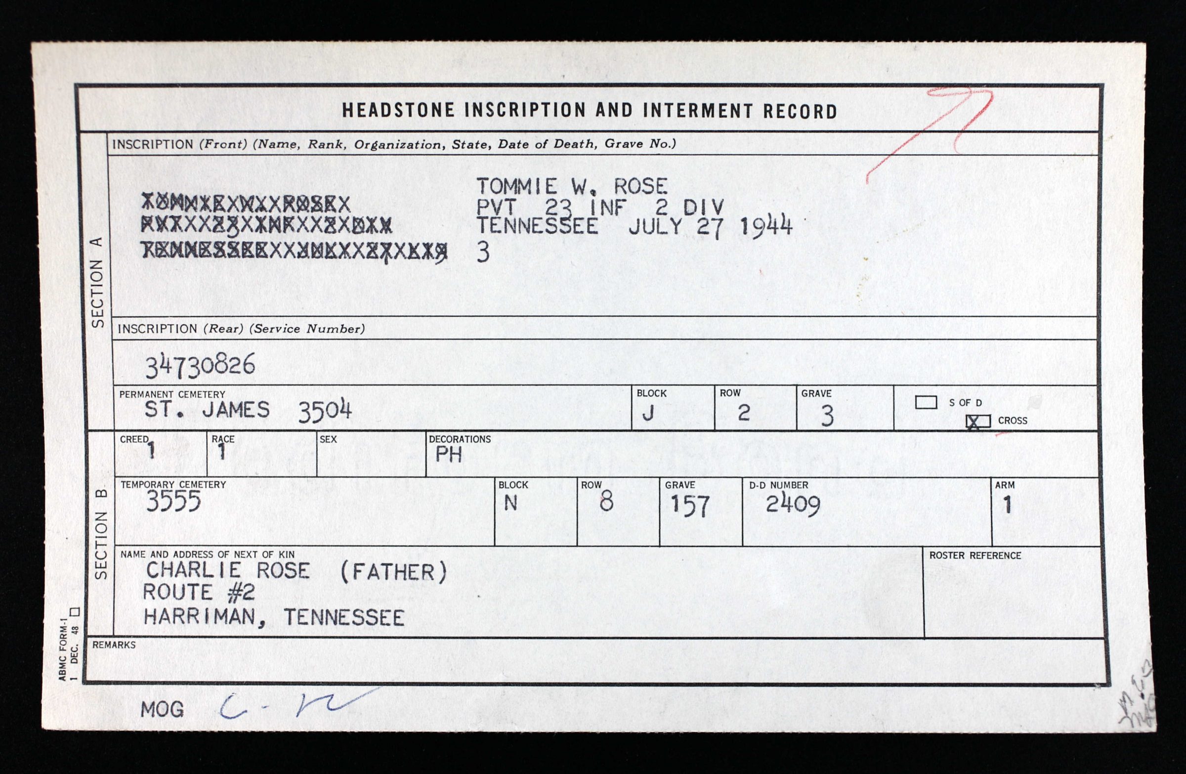 Private Tommie W. Rose was assigned to the 23rd Infantry Regiment, 2nd Infantry Division. At the time of his death the 23rd Inf Reg had landed across Omaha Beach and was involved in fighting through the hedgerows of the Normandy Region. He was Killed in Action 27 July 1944. He was initially buried at Marigny Cemetery at Saint Lo, France and reburied at Brittany American Cemetery, St James, France, J,2,3.