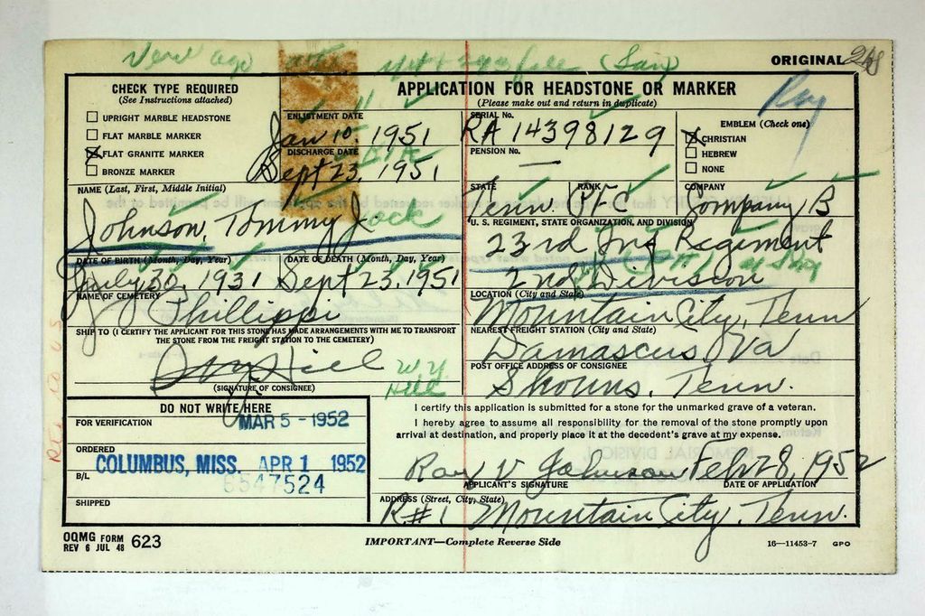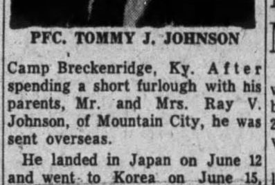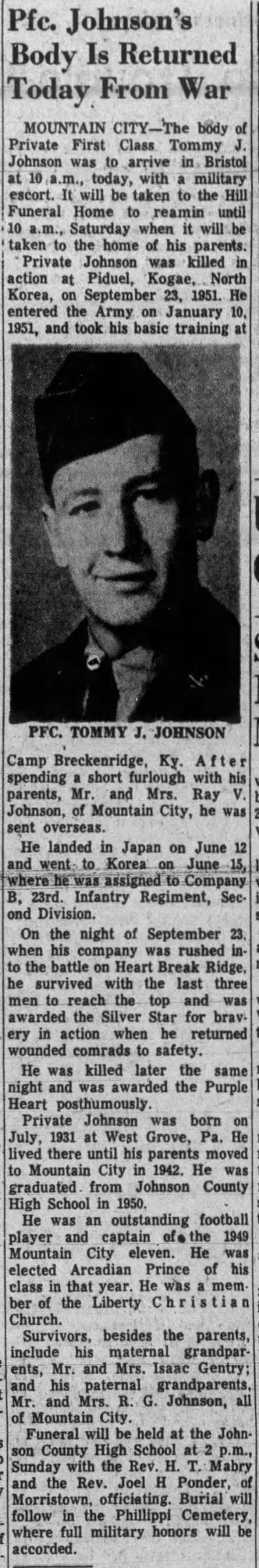 The body of Private First Class was to arrive in Bristol, with a military escort. It will be taken to the Hill Funeral Home to reamin until Saturyday when it will be taken to the home of his parents. Private Johnson was killed in action in Piduel, Kogae, North Korea, on September 23, 1951. He entered the Army on January 10, 1951, and took his basic training at Camp Breckenridge, Ky. After spending a short furlough with his parents, Mr. and Mrs. Ray V. Johnson of Mountain City, he was sent overseas. He landed in Japan on June 12 and went to Korea on June 15, where he was assigned to Company B, 23rd Infantry Regiment, Second Division. On the night of September 23, when his company was rushed into the battle of Heart Break Ridge, he survived with the last three men to reach the top and was awarded the Silver Star for bravery in action when he returned wounded comrads to safety. He was killed later the same night and was awarded the Purple Heart posthumously. Private Johnson was born on July, 1931 at West Grove, Pa. He lived there until his parents moved to Mountain City in 1942. He was graduated from Johnson County High School in 1950. He was an outstanding football player and captain of the 1949 Mountain City eleven. He was elected Arcadian Prince of his class of that year. He was a member of the Liberty Christian Church.