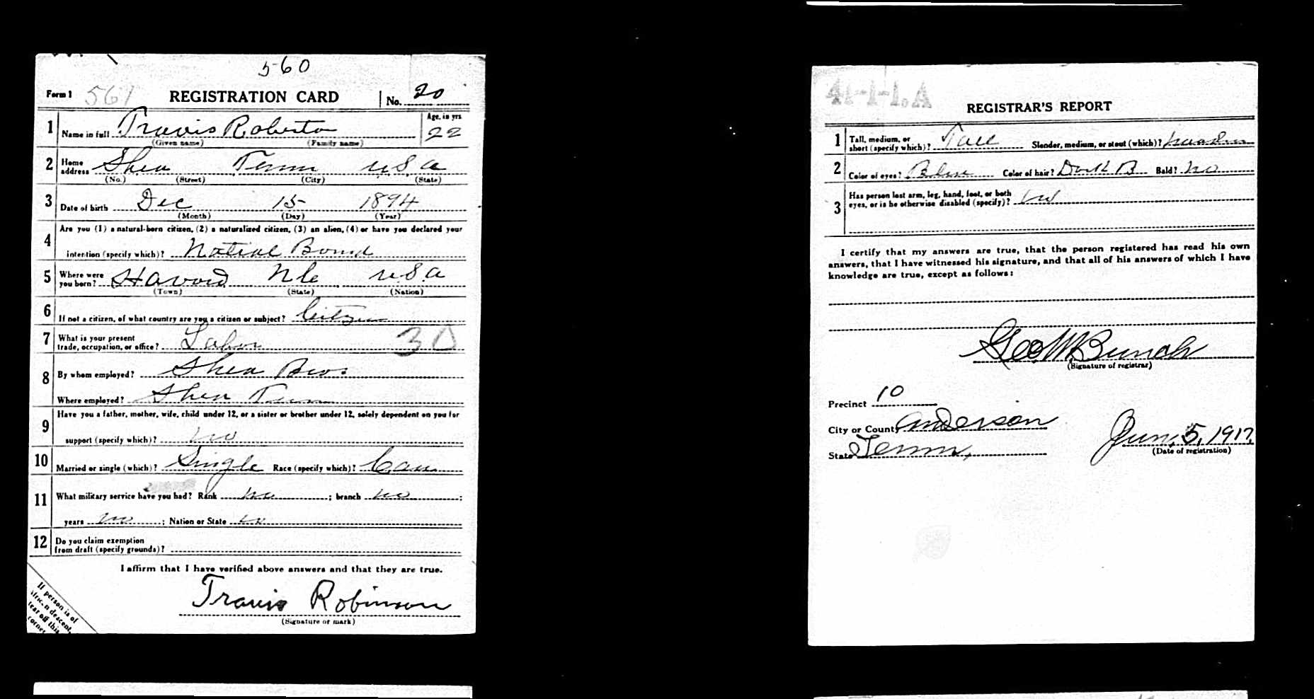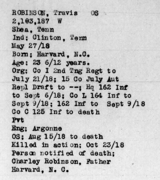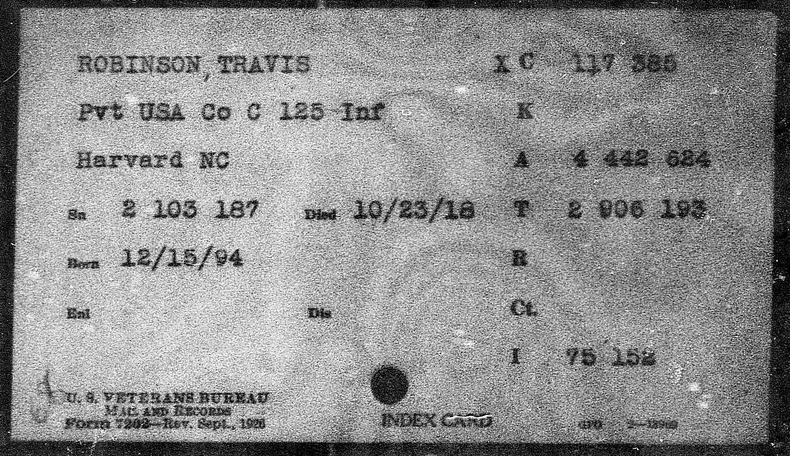 Travis Robinson was born in Harvard, North Carolina, son of Charles Cisco Robinson and Julia Ann Westall.