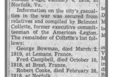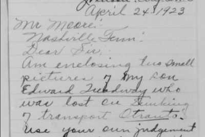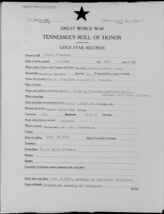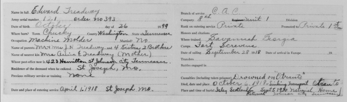 He died on 6 October 1918. He drowned with the sinking of the Transport “Otranto“. He was initially buried at Islay in Scotland and for the last time at Johnson City, TN on September 5, 1920