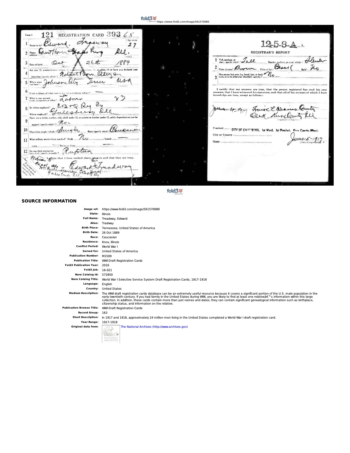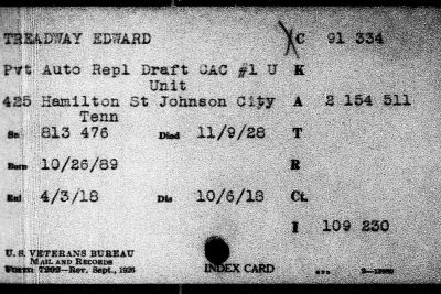 On 4 June 1917, Eddie was working with the C B & Q in Galesburg, Knox County, Illinois when he completed his Registration Card for the Draft. He was exempted from service due to his job with the railroad. Later, he decided he wanted to serve his country and enlisted in the United States Army on 1 April 1918 in St. Joseph, Missouri and listed his mother as his next of kin living in Elkmont, Sevier County, Tennessee. Since he completed his Draft Card in Galesburg, Knox County, Illinois, they carried Eddie on their state rolls.