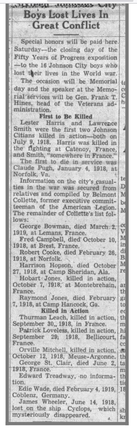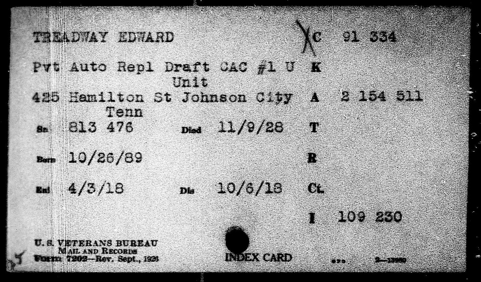 Thomas Treadway was born in Chuckey on the Washington County, Tennessee side on 26 October 1889. He later moved with his family just down the road to the Conklin Community and then to Johnson City, both in Washington County. Around 1909, Eddie moved to St. Joseph, Buchanan County, Missouri to work as a Machine Molder and Laborer with the Chicago, Burlington & Quincy (C B & Q) Railroad Company.