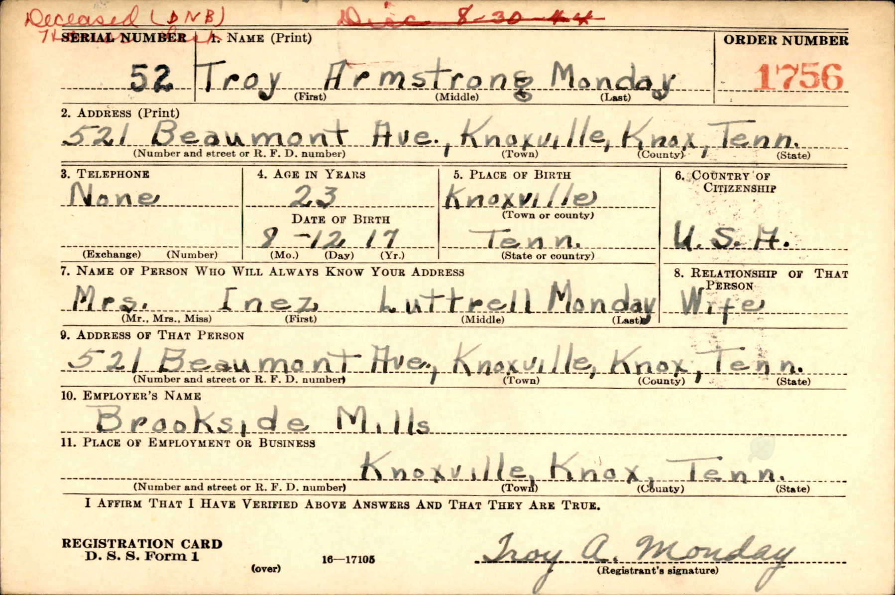 Troy Armstrong Monday was Born on 12 August 1917, Knoxville, Tennessee, the son of George K. Monday and Parlia Elmina Lay. He was married to Inez Luttrell and was father of Bobbie Jean and Edward Allen Monday.