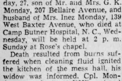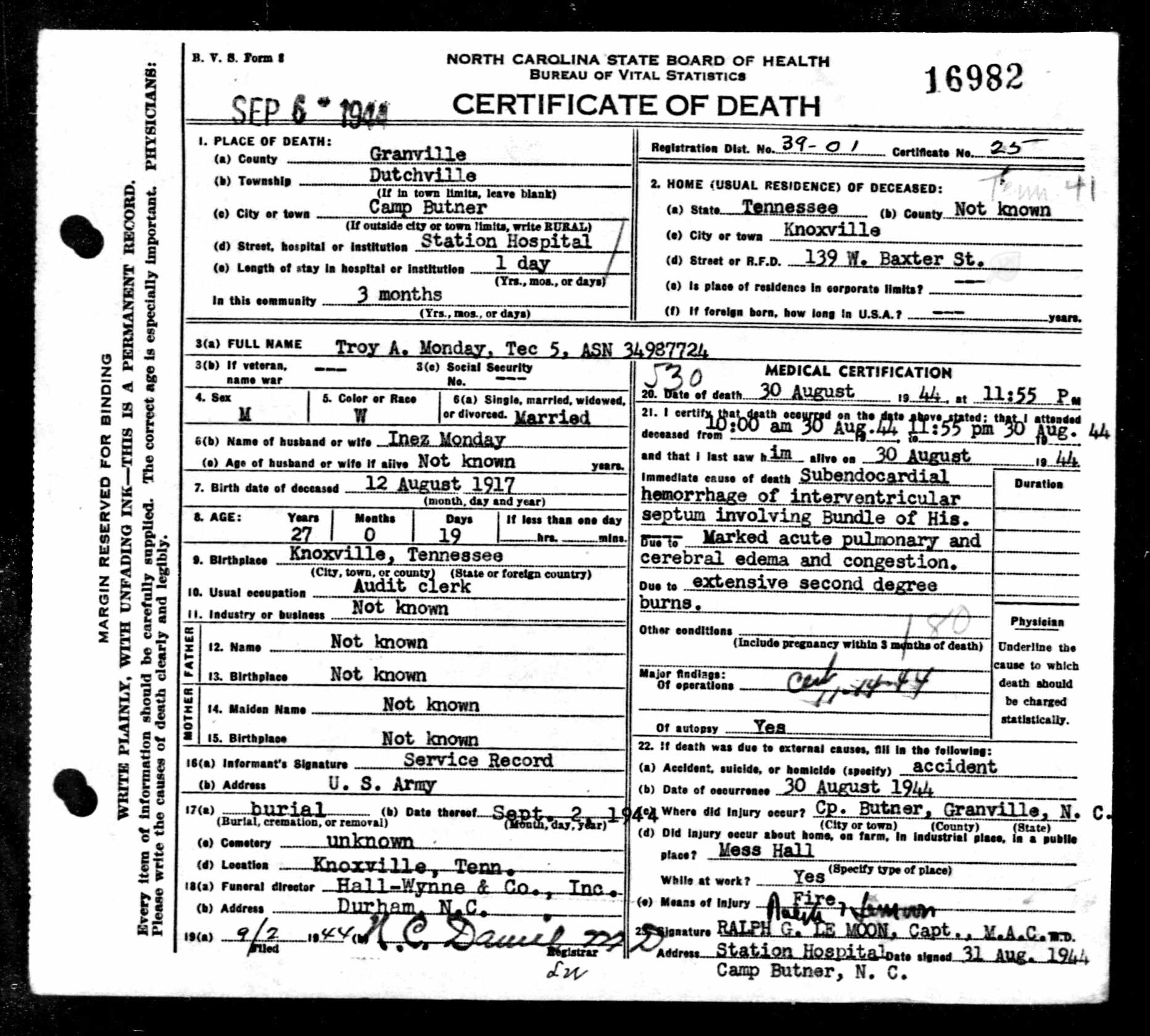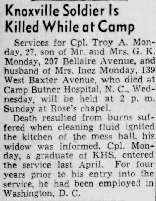 T/5 Monday died at the Station Hospital at Dutchville, Granville County in North Carolina of wounds caused by a fire accident at the Mess Hall at Camp Butner, Granville in North Carolina. He was the husband of Inez Monday.