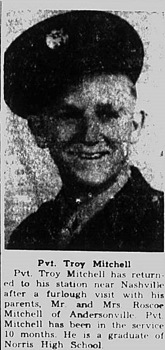 Pvt. Troy Mitchell has returned to his station near Nashville after a furlough visit with his parents, Mr. and Mrs. Roscoe Mitchell of Andersonville. Pvt. Mitchell has been in the service 10 months. He is a graduate of Norris High School.