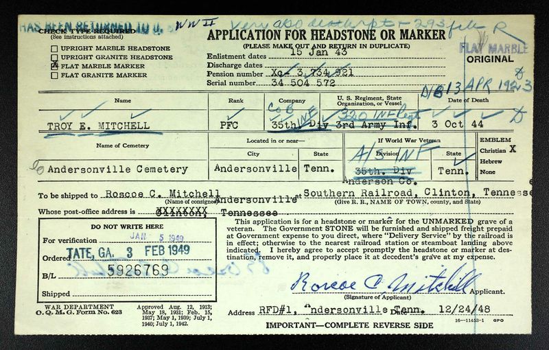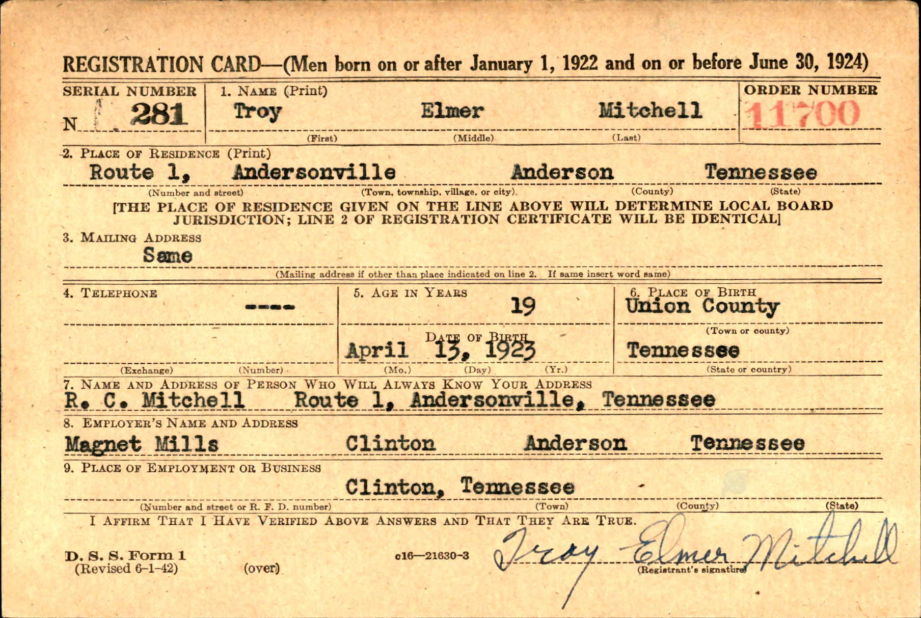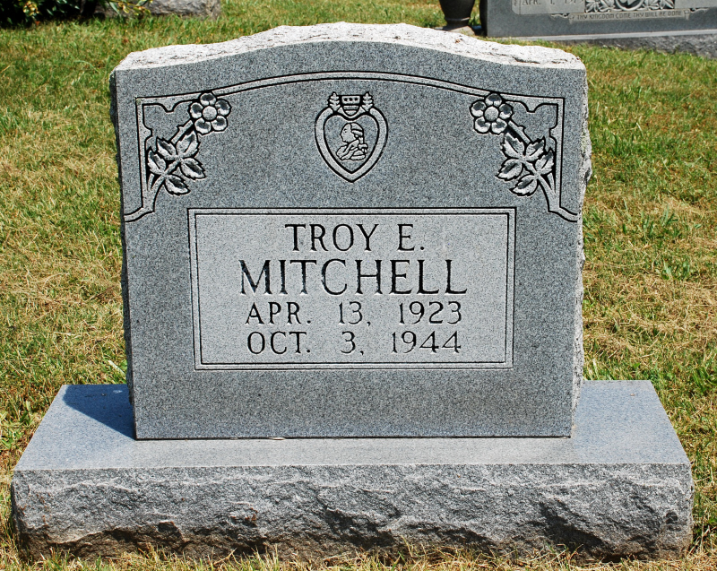 PFC Troy Elmer Mitchell was born in Union County, Tennessee on April 13, 1923, the son of Roscoe Caswell Mitchell and Maymie Susan George. Brother of Wanda Oueita Mitchell