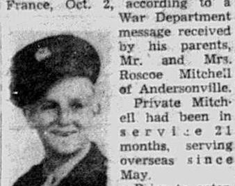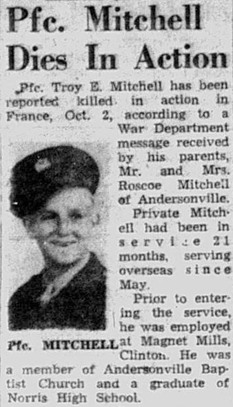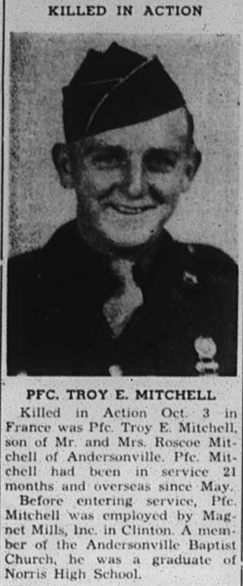 Pfc. Troy E. Mitchell has been reported killed in action in France, Oct. 2, according to a War Department message received by his parents, Mr. and Mrs. Roscoe Mitchell of Andersonville. Private Mitchell had been in service 21 months, serving overseas since May.