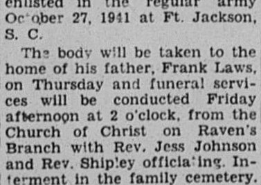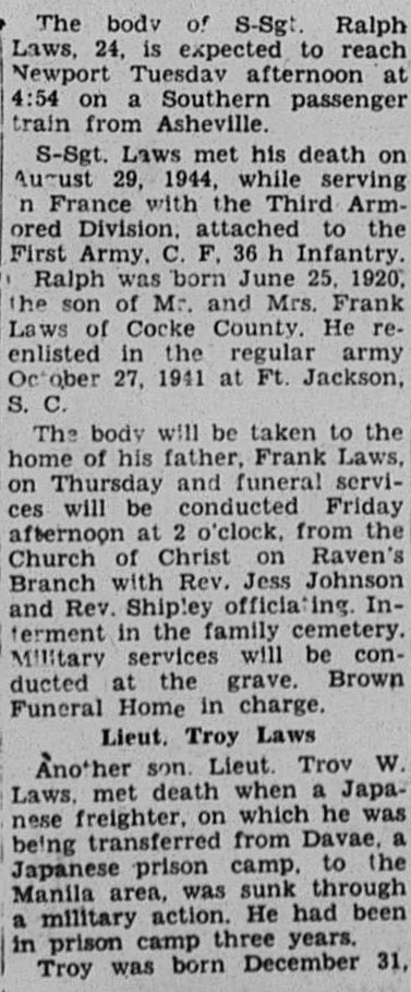 S-Sgt. Laws met his death on August 29, 1944, while serving in France with the Third Armored Division, attached to the First Army, C.F. 36 h Infantry. Ralph was born June 25, 1920, the son of Mr. and Mrs. Frank Laws of Cocke County. He re-enlisted in the regular army October 27, 1941 at Ft. Jackson, S.C. Interment in the family cemetery. Military services will be conducted at the Grave.