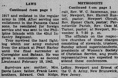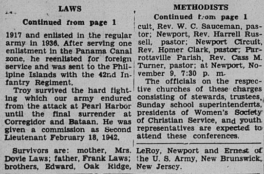 Another son, Lieut. Troy W. Laws, met death when a Japanese freighter, on which he was being transferred from Davae, a Japanese prison camp, to the Manila area, was sunk through a military action. He had been in prison camp three years. Troy was born December 31, 1917 and enlisted in the regular army in 1936. After serving one enlistment in the Panama Canal zone, he re-enlisted for foreign service and was sent to the Philippine Islands with the 42nd Infantry Regiment. Troy served the hard fighting which our army endured from the attack at Pearl Harbor until the final surrender at Corregidor and Bataan. He was given a commission as Second Lieutenant February 18, 1942.