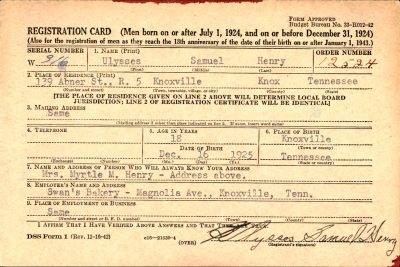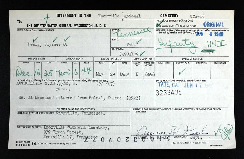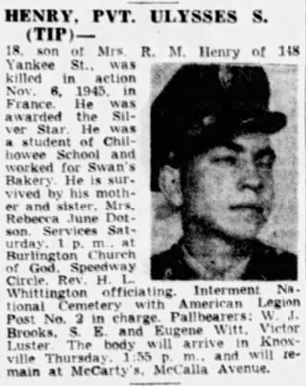 Pvt Ulysses Samuel Henry was born at Knoxville, Tennessee, the son of Rutherford Maskel Henry and Myrtle Carter. He enlisted on 12 March 1944 at Camp Shelby, Mississippi. He was initially buried at Epinal, France. He was buried May 29, 1948, at US National Cemetery, Knoxville, B, 6696.