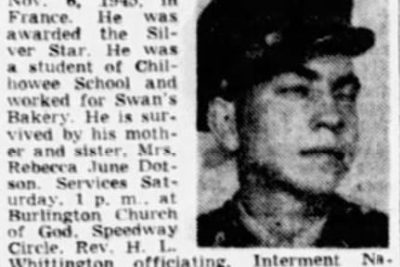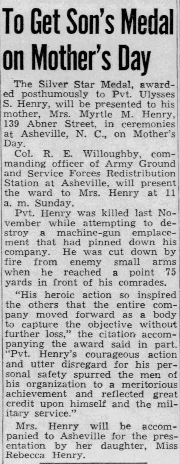 The Silver Star Medal, awarded posthumously to Pvt. Ulysses S. Henry, will be presented to his mother, Mrs. Myrtle M. Henry, 139 Abner Street, in ceremonies in Ashville, N.C. on Mother’s Day. Col. R.E. Willoughby, commanding officer of Army Ground and Service Forces Redistribution Station at Ashville, will present the ward to Mrs. Henry at 11 a.m. Sunday. Pvt. Henry was killed last November, while attempting to destroy a machine-gun emplacement that had pinned down his company. He was cut down by fire from enemy small arms when he reached a point 75 yards in front of his comrades. “His heroic action si inspired the others that the entire company moved forward as a body to capture the objective without further loss,” the citation accompanying the award said in part. “Pvt. Henry’s courageous action and utter disregard for his personal safety spurred the men of his organization to a meritorious achievement and reflected great credit upon himself and the military service.”